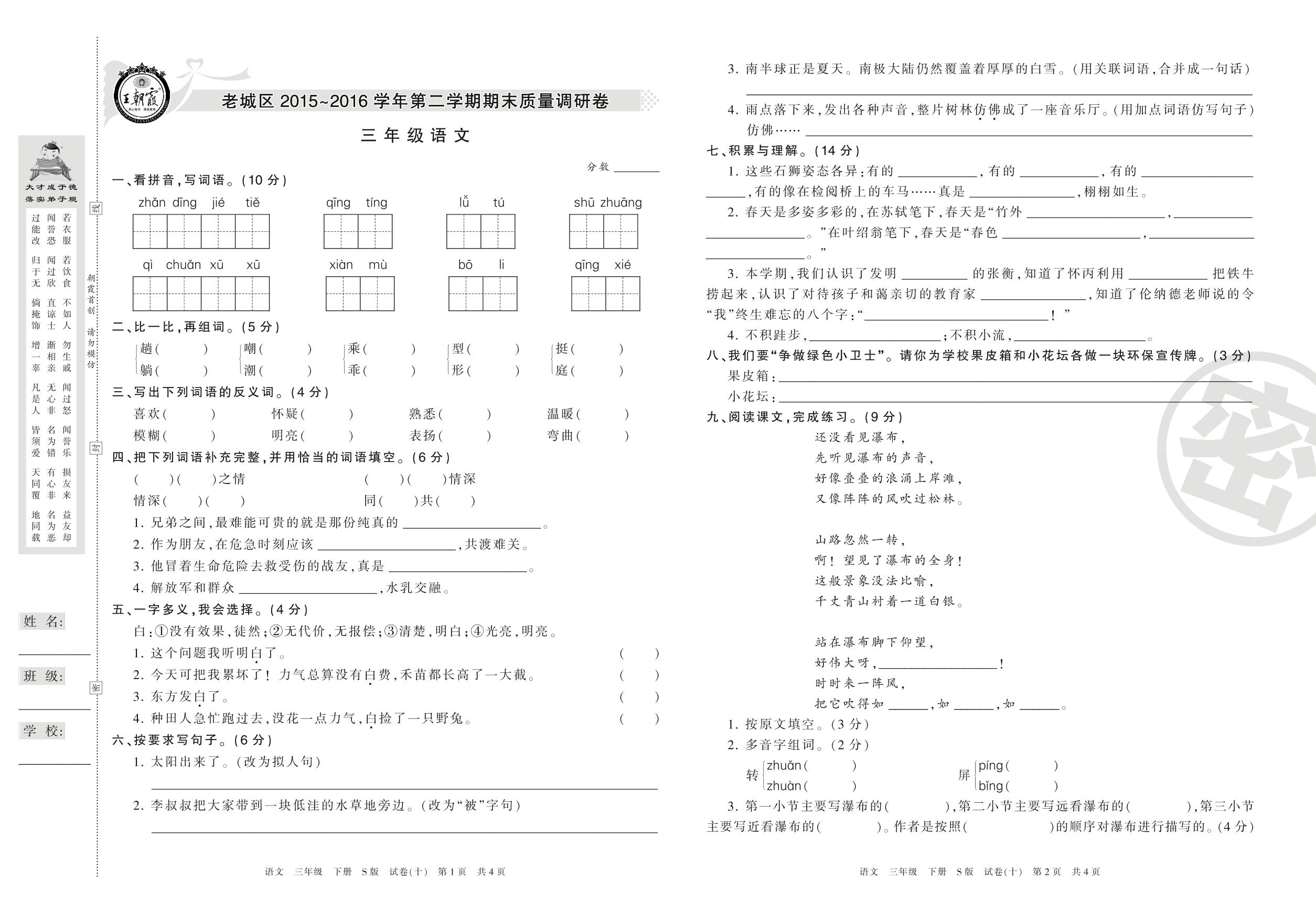 2015-2016学年第二学期洛阳市老城区三年级语文试卷(S版)【10】
