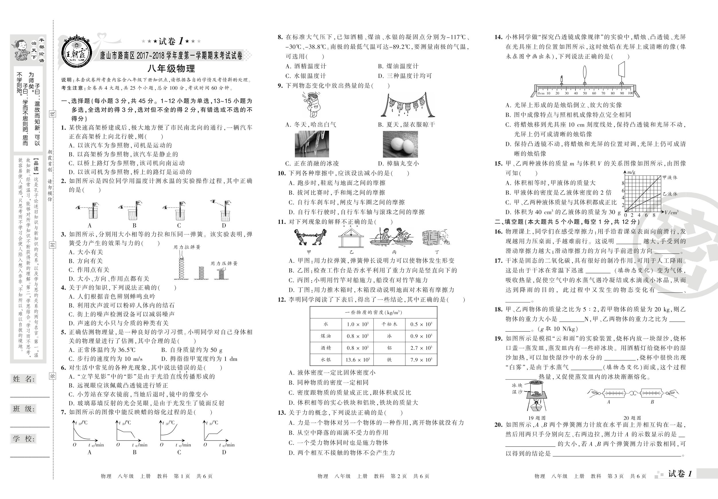 2017-2018学年第一学期唐山市路南区八年级物理试卷(教科版)【1】