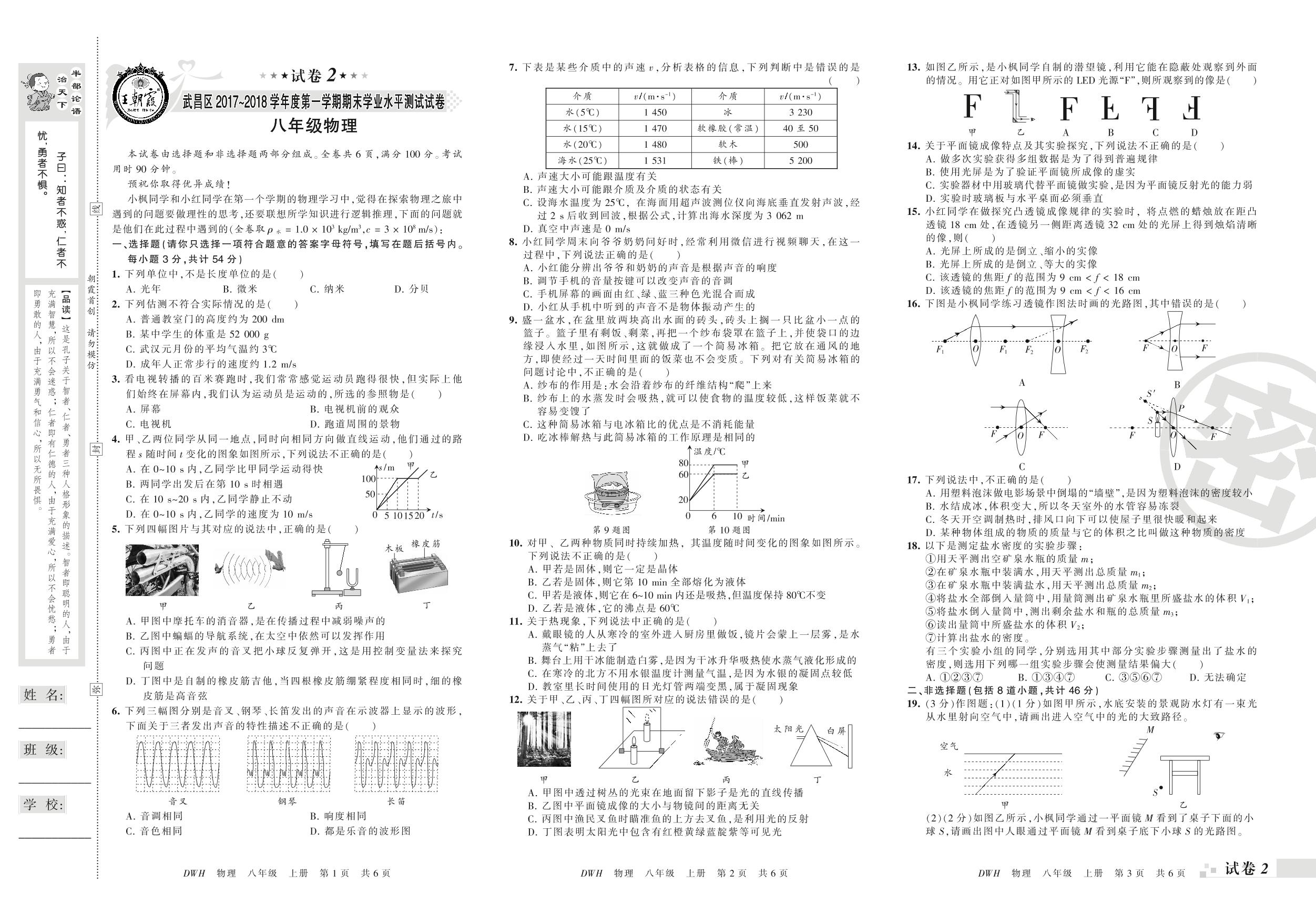 2017-2018学年第一学期武汉市武昌区八年级物理试卷(人教版)【2】