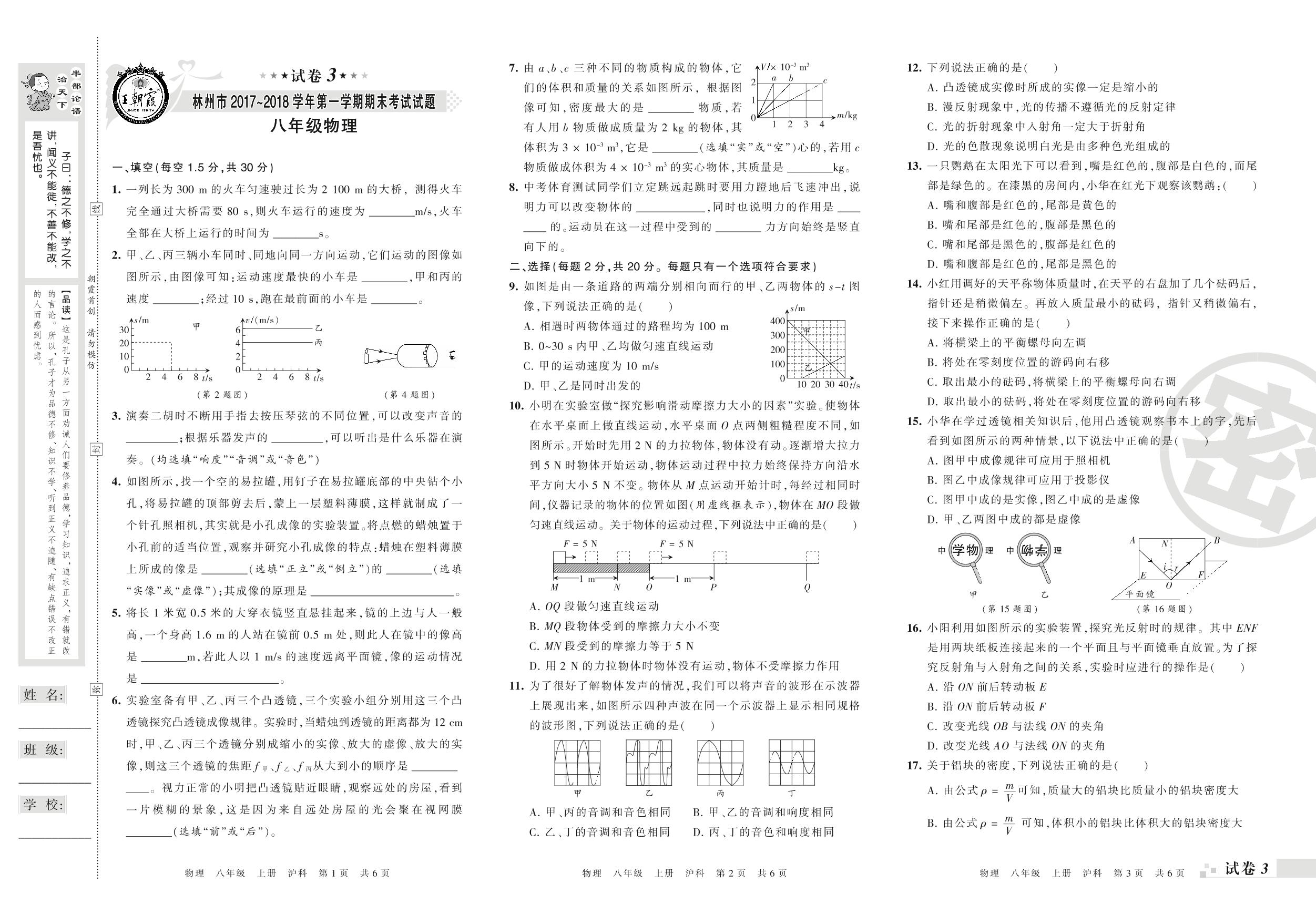 2017-2018学年第一学期林州市八年级物理试卷(沪科版)【3】