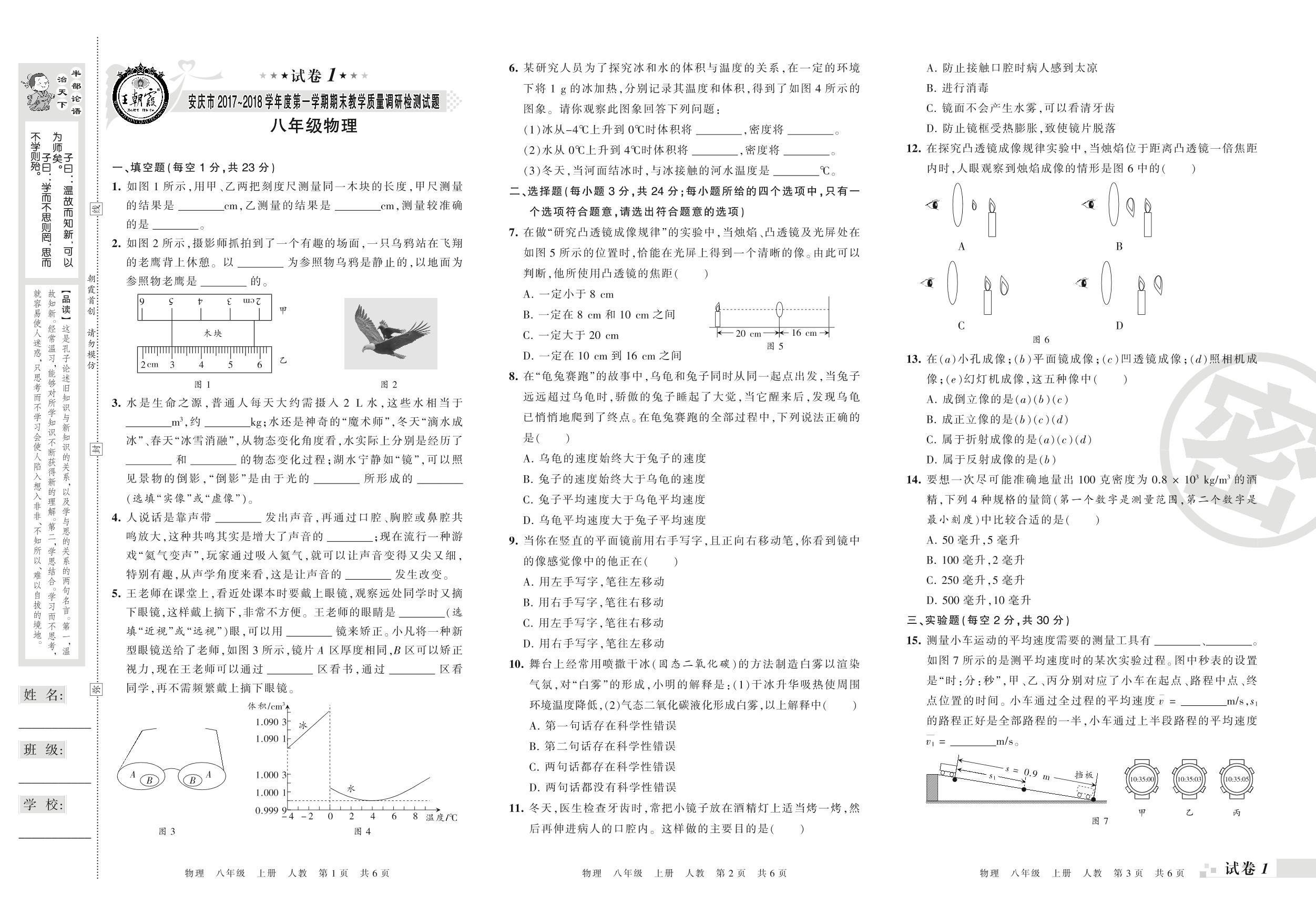 2017-2018学年第一学期安庆市八年级物理试卷(人教版)【1】