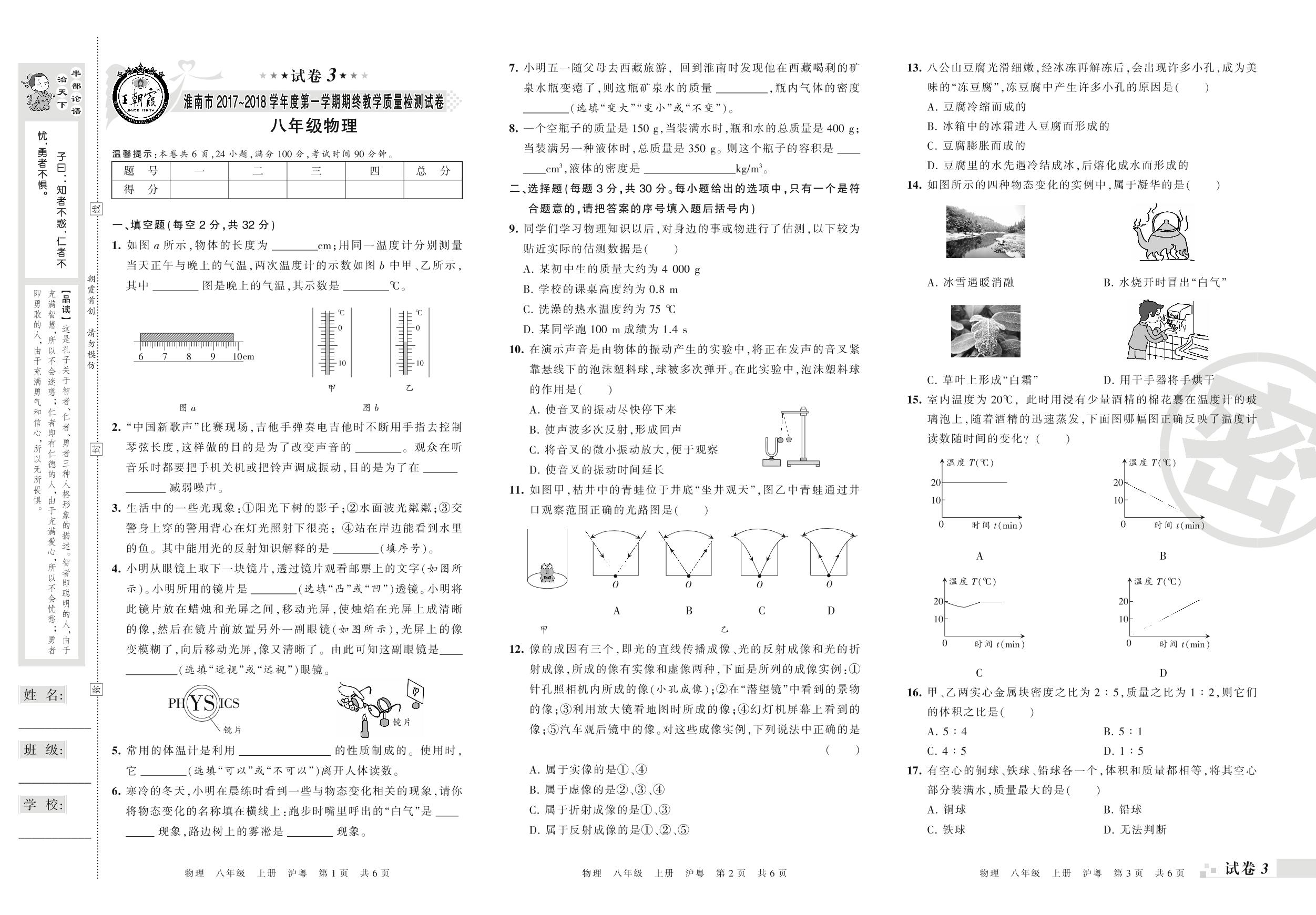 2017-2018学年第一学期淮南市八年级物理试卷(沪粤版)【3】
