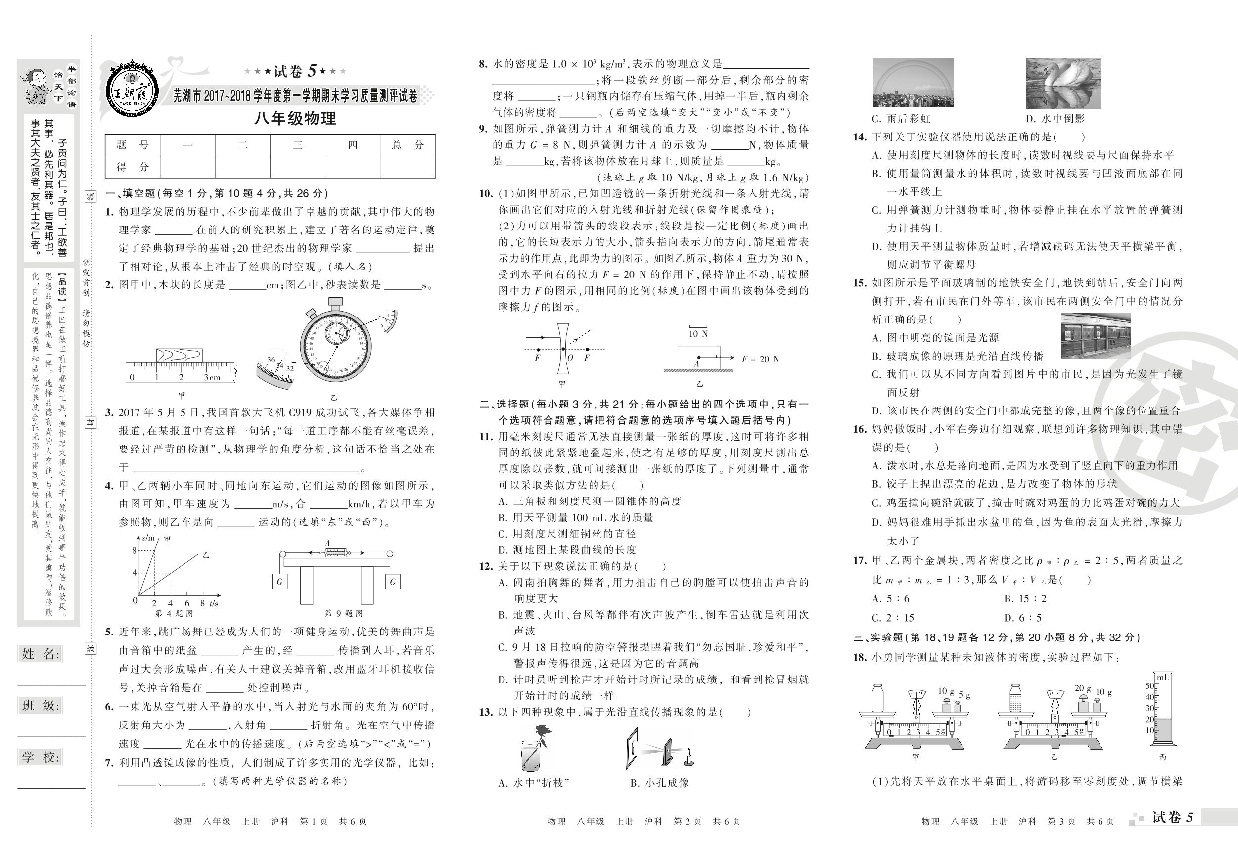 2017-2018学年第一学期芜湖市八年级物理试卷(沪科版)【5】