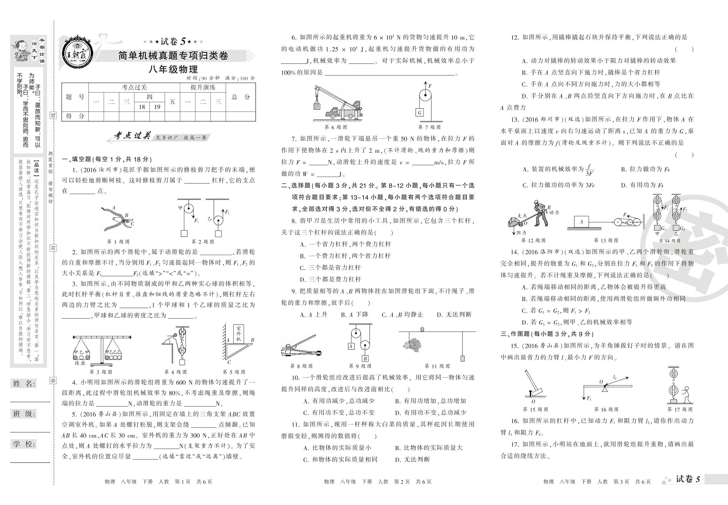王朝霞期末专项卷——简单机械真题专项归类卷八年级下册物理(人教版)【5】