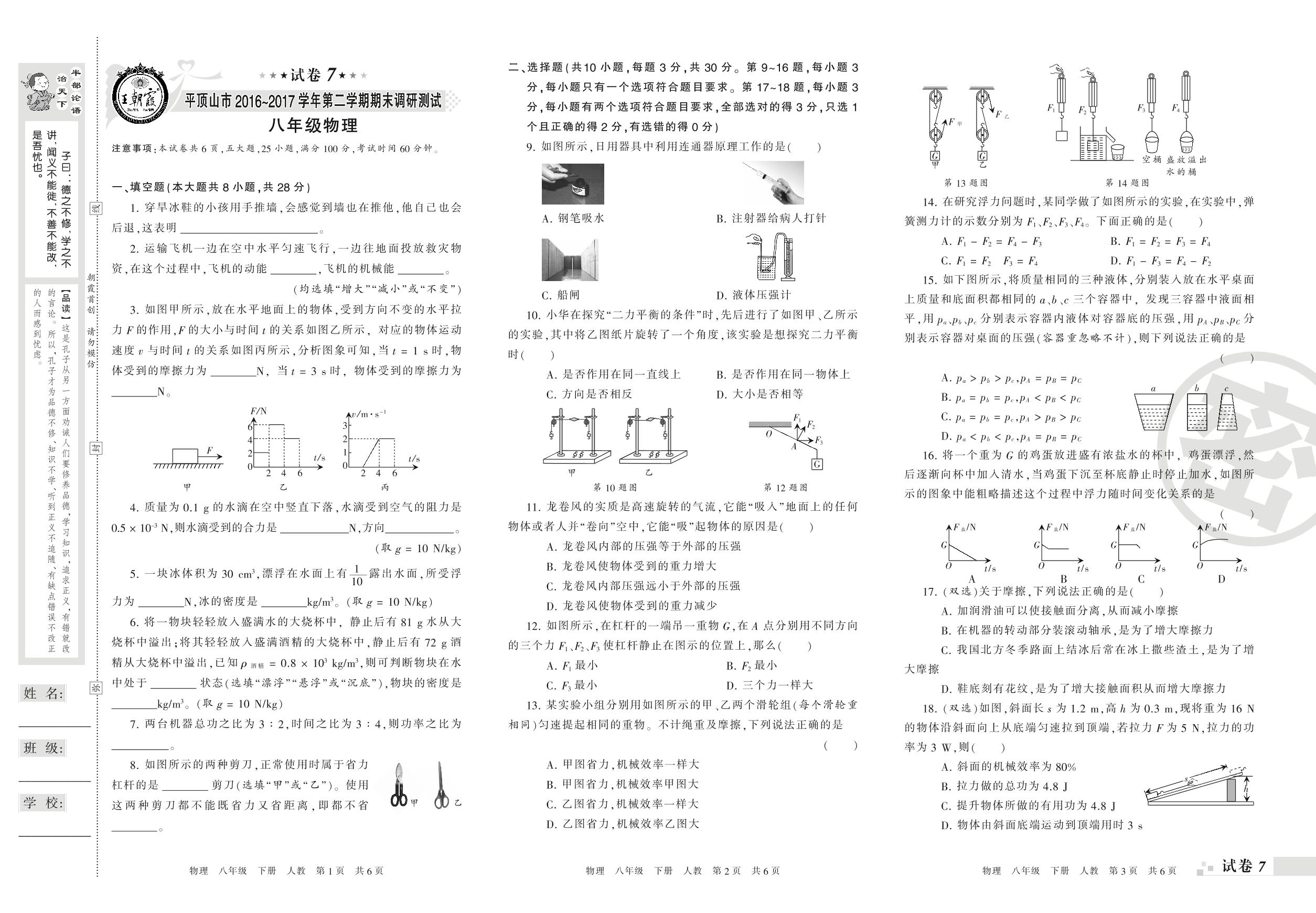 八年级物理人教版下册期末卷