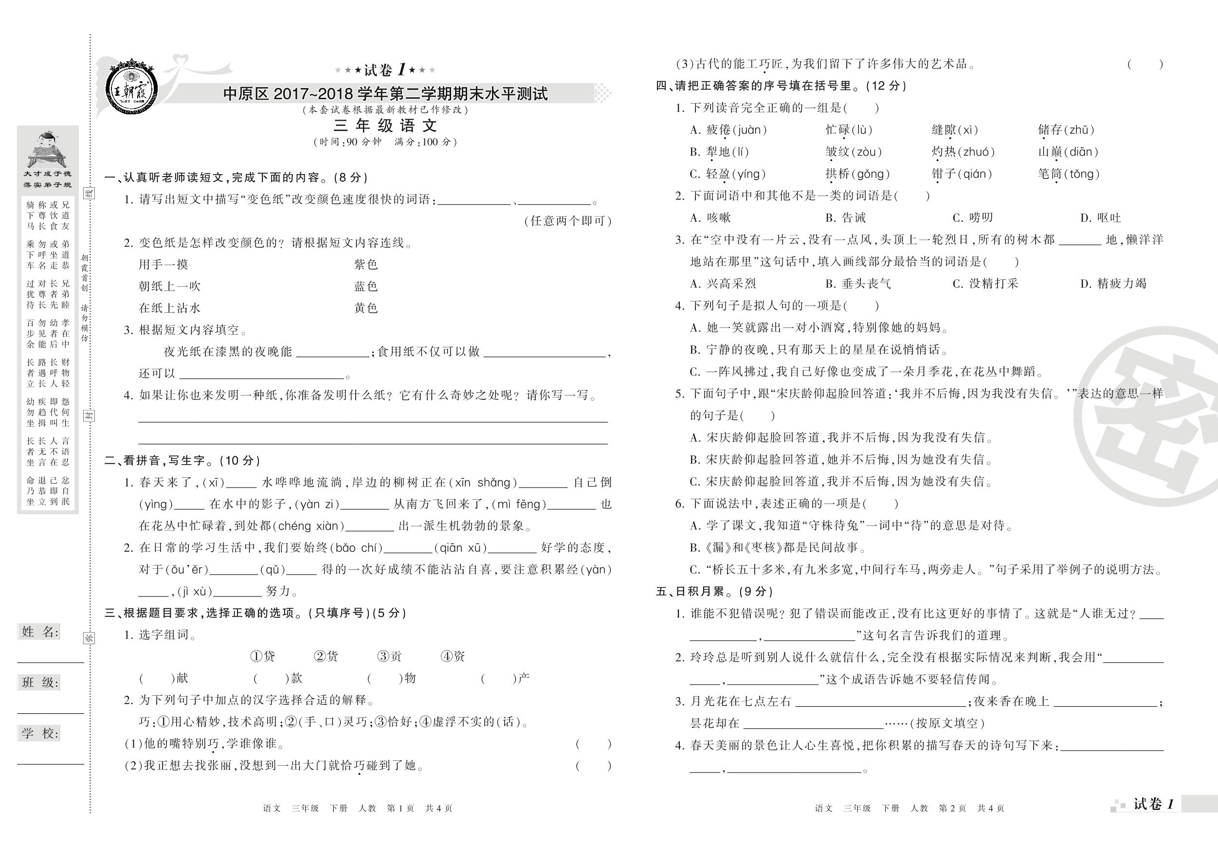 2017-2018学年第二学期郑州市中原区三年级语文试卷(人教版)_R21080194245【1】