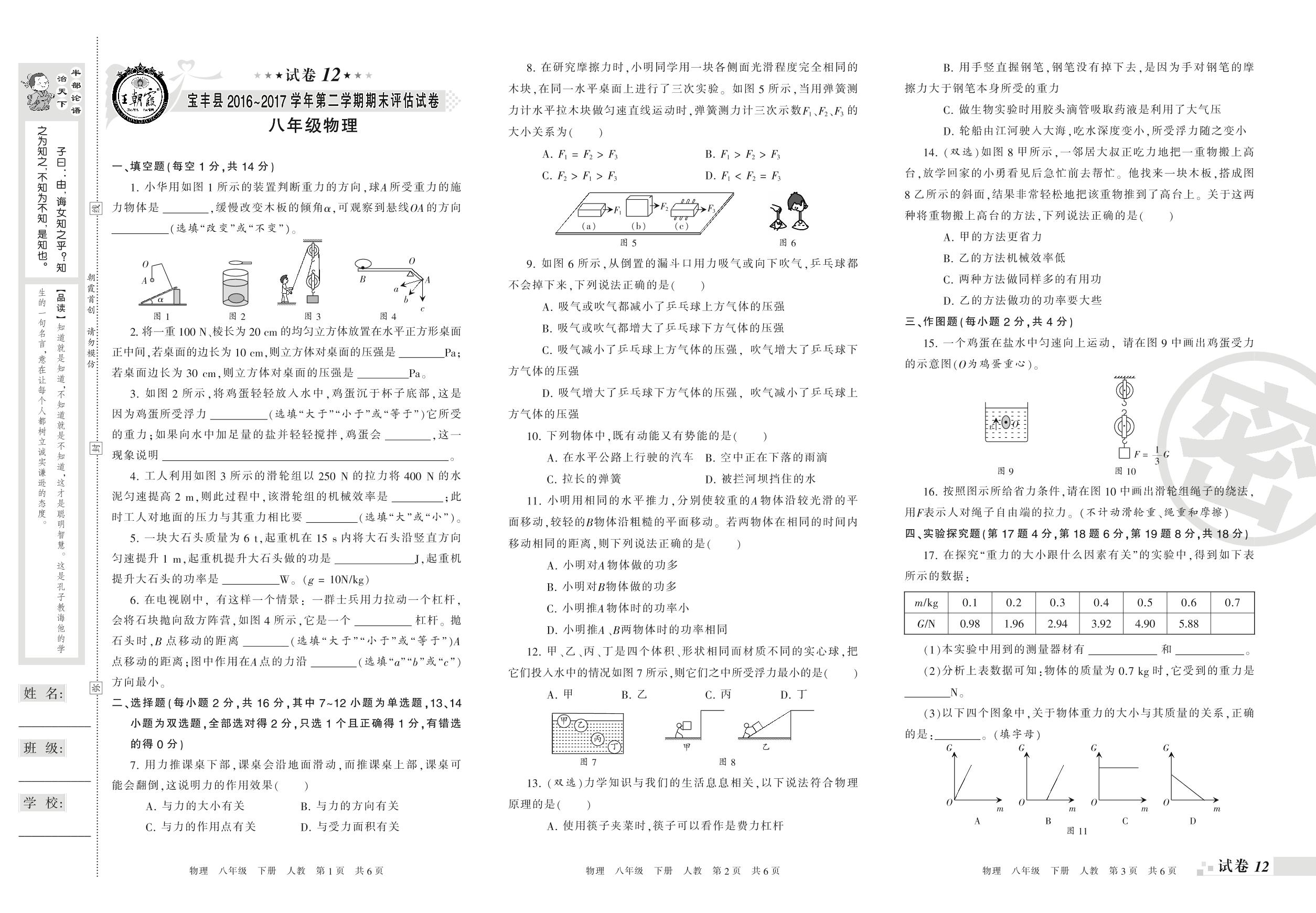 2016-2017学年第二学期平顶山市宝丰县八年级物理试卷(人教版)【12】