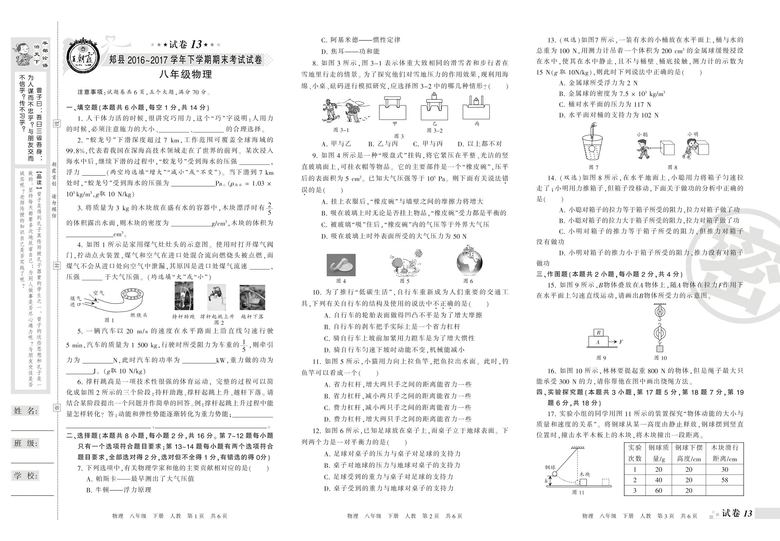 2016-2017学年第二学期平顶山市郏县八年级物理试卷(人教版)【13】