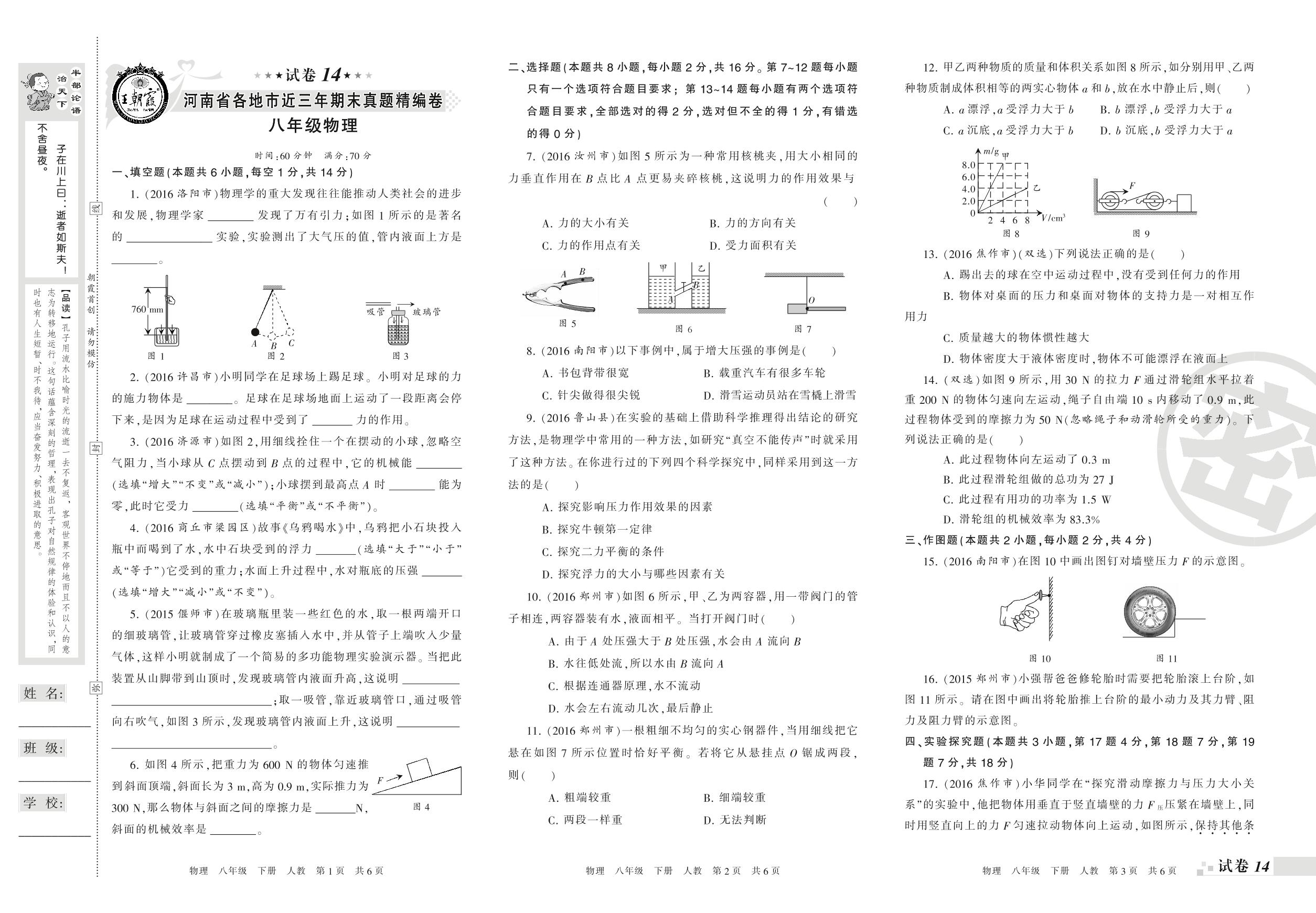 河南省各地市近三年期末真题精编卷八年级下册物理(人教版)【14】