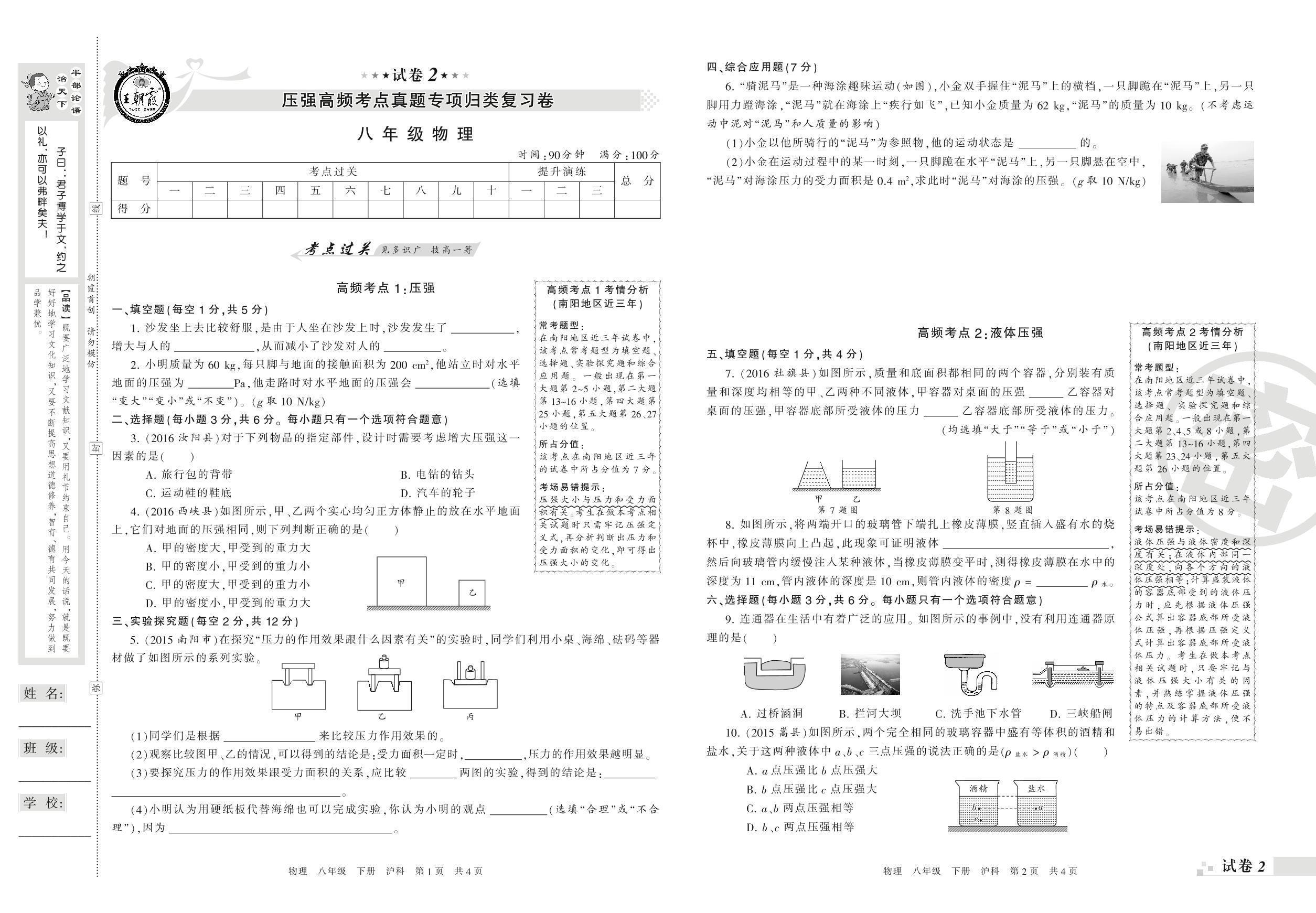 王朝霞期末专项卷——压强高频考点真题专项归类复习卷八年级下册物理(沪科版)【2】