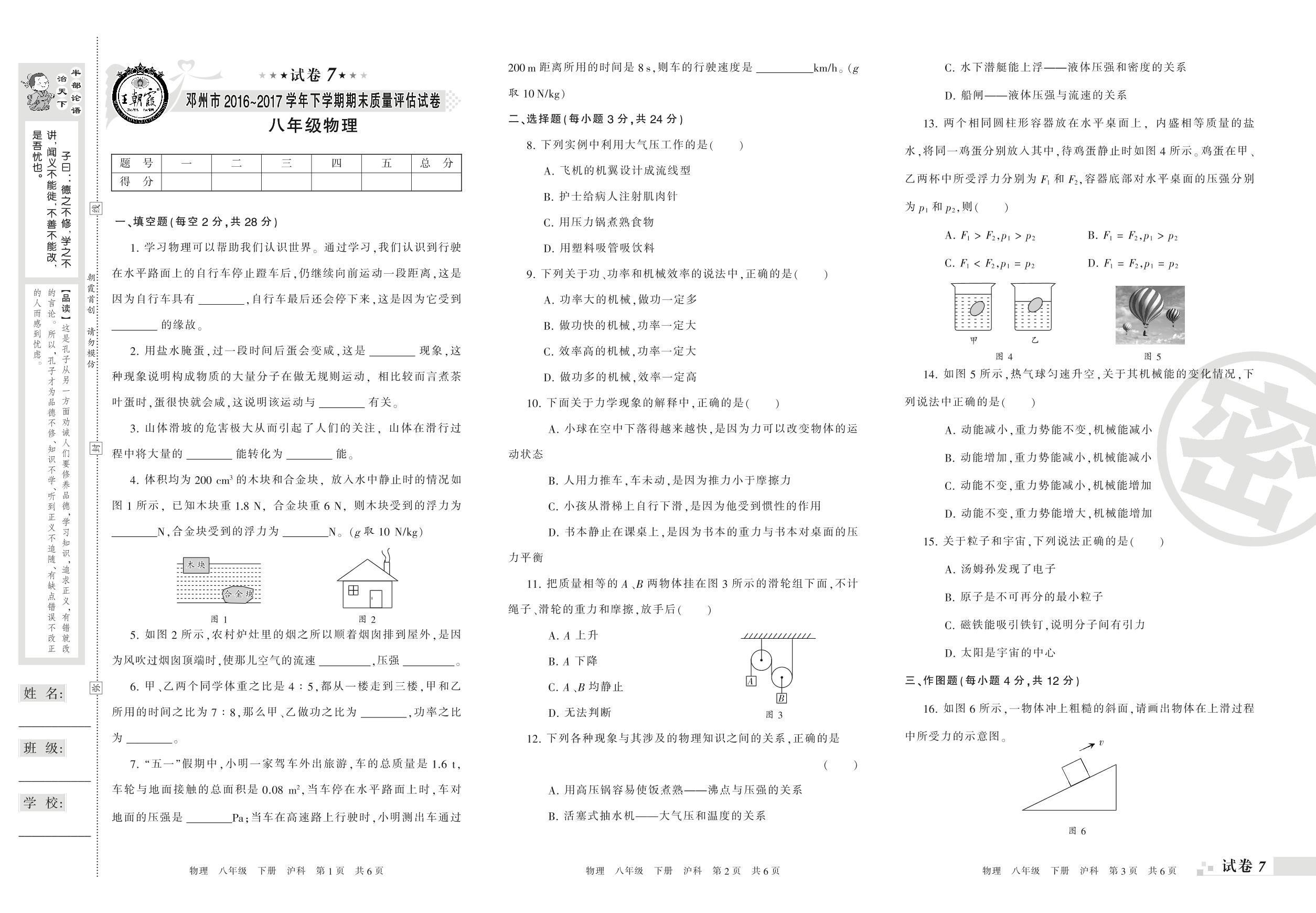 2016-2017学年第二学期邓州市八年级物理试卷(沪科版)【7】