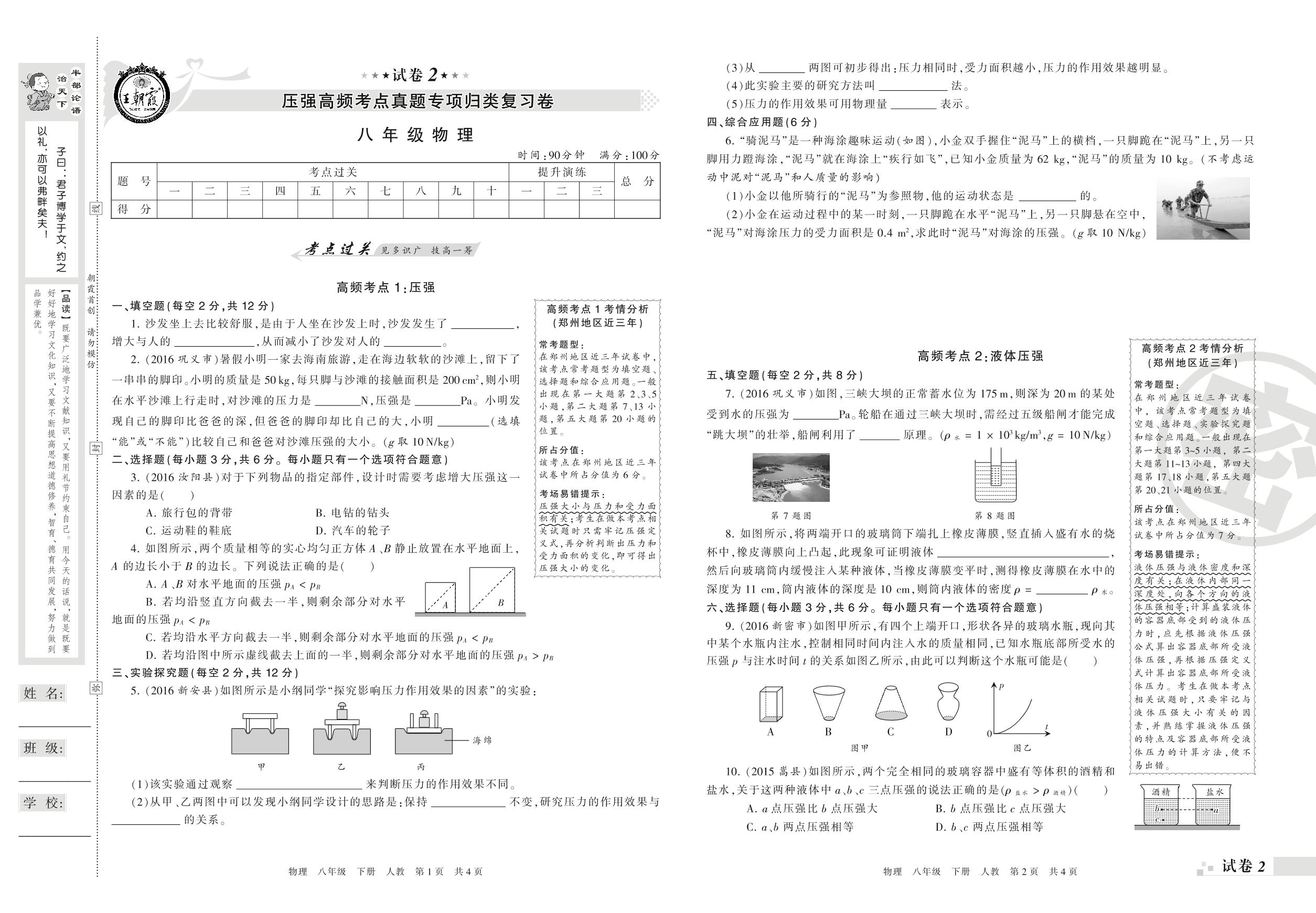 王朝霞期末专项卷——压强高频考点真题专项归类复习卷八年级下册物理(人教版)【2】