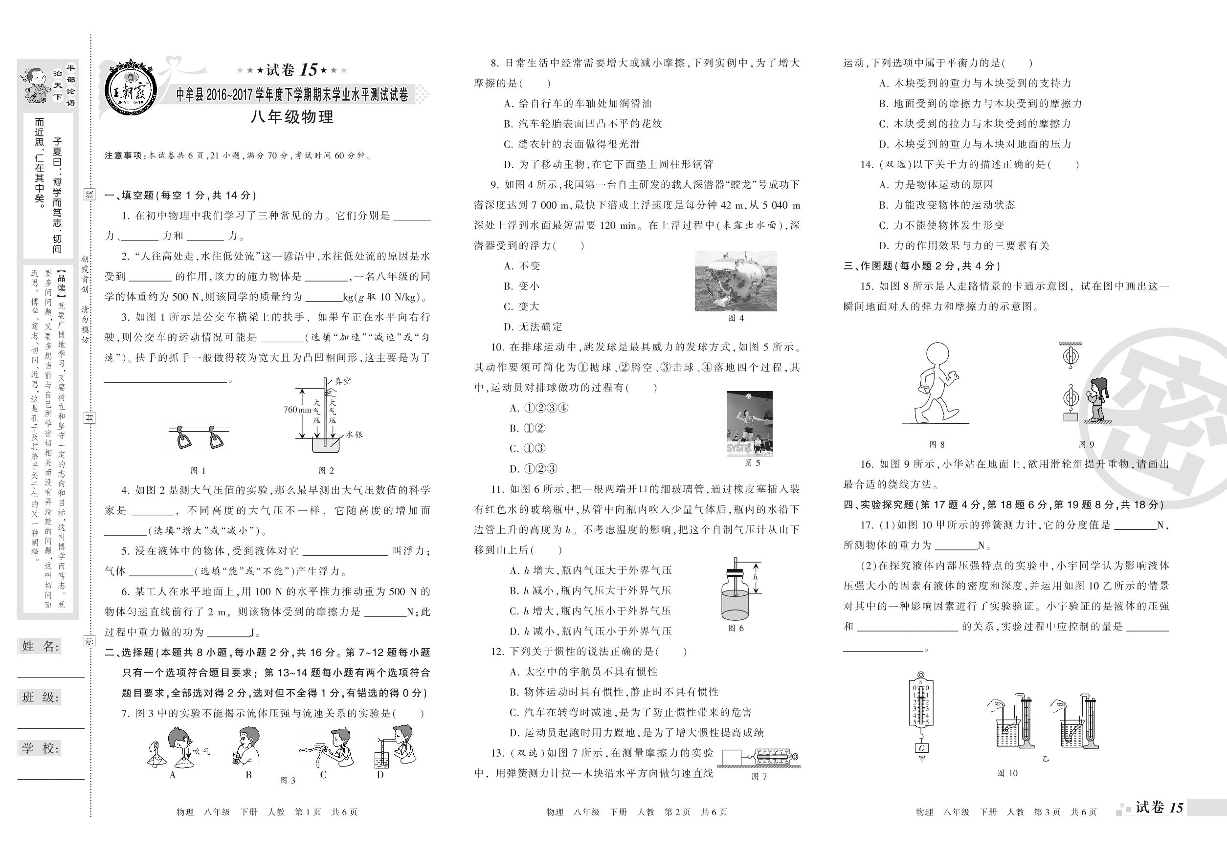 八年级物理人教版下册期末卷