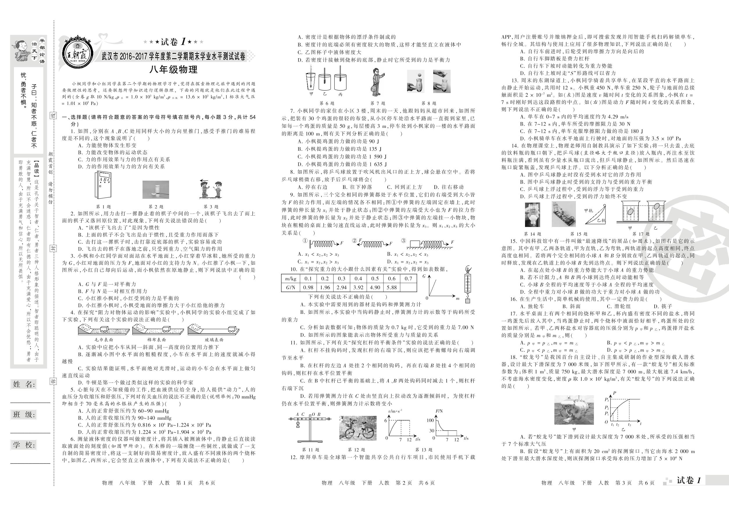 2016-2017学年第二学期武汉市八年级物理试卷(人教版)【1】
