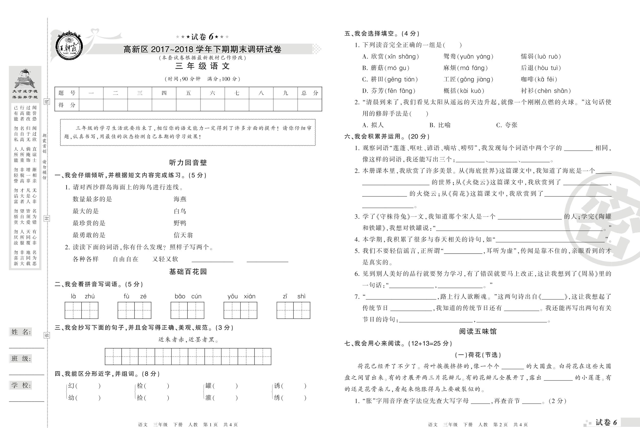 2017-2018学年第二学期郑州市高新区三年级语文试卷(人教版)【6】