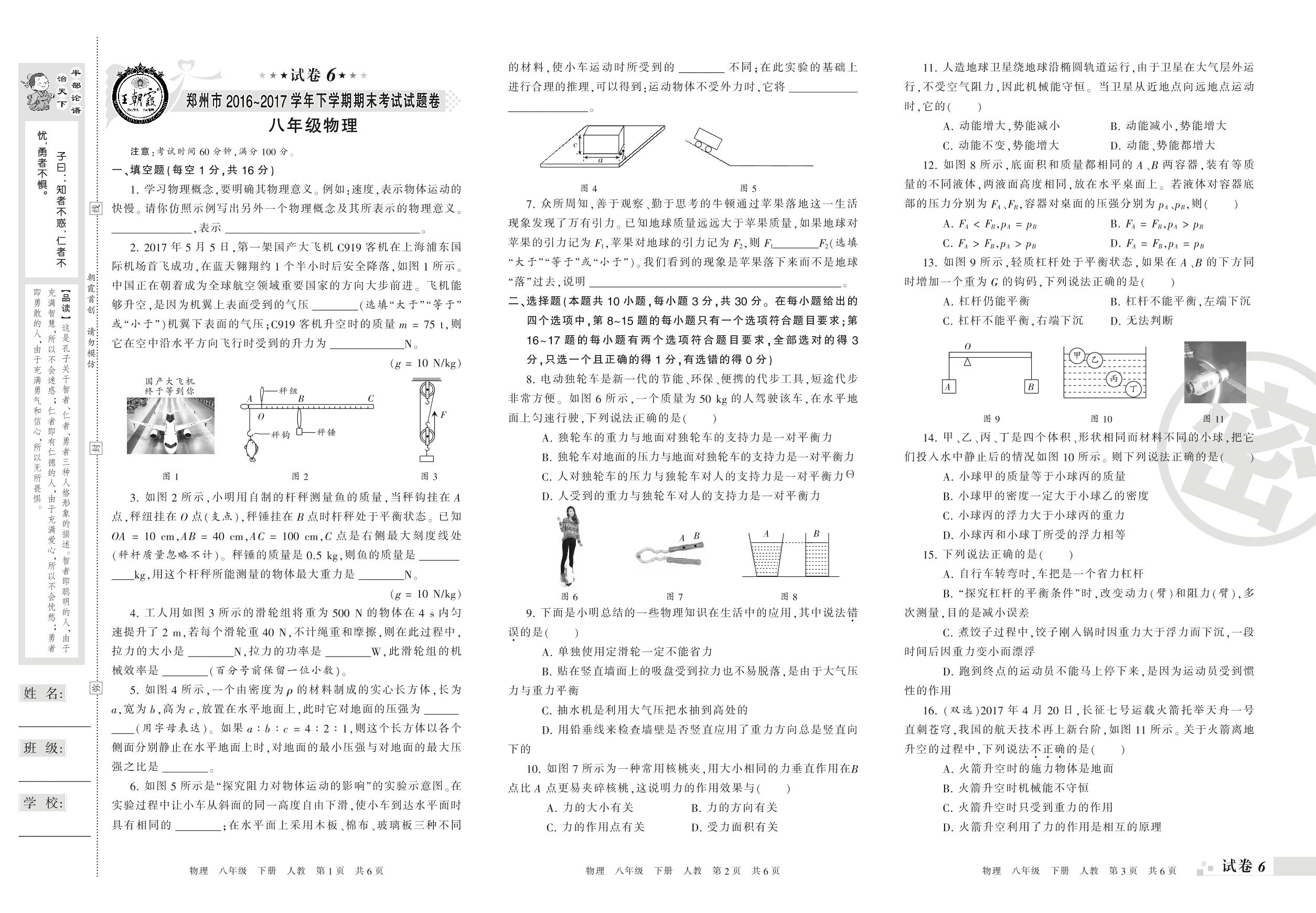 2016-2017学年第二学期郑州市八年级物理试卷(人教版)【6】