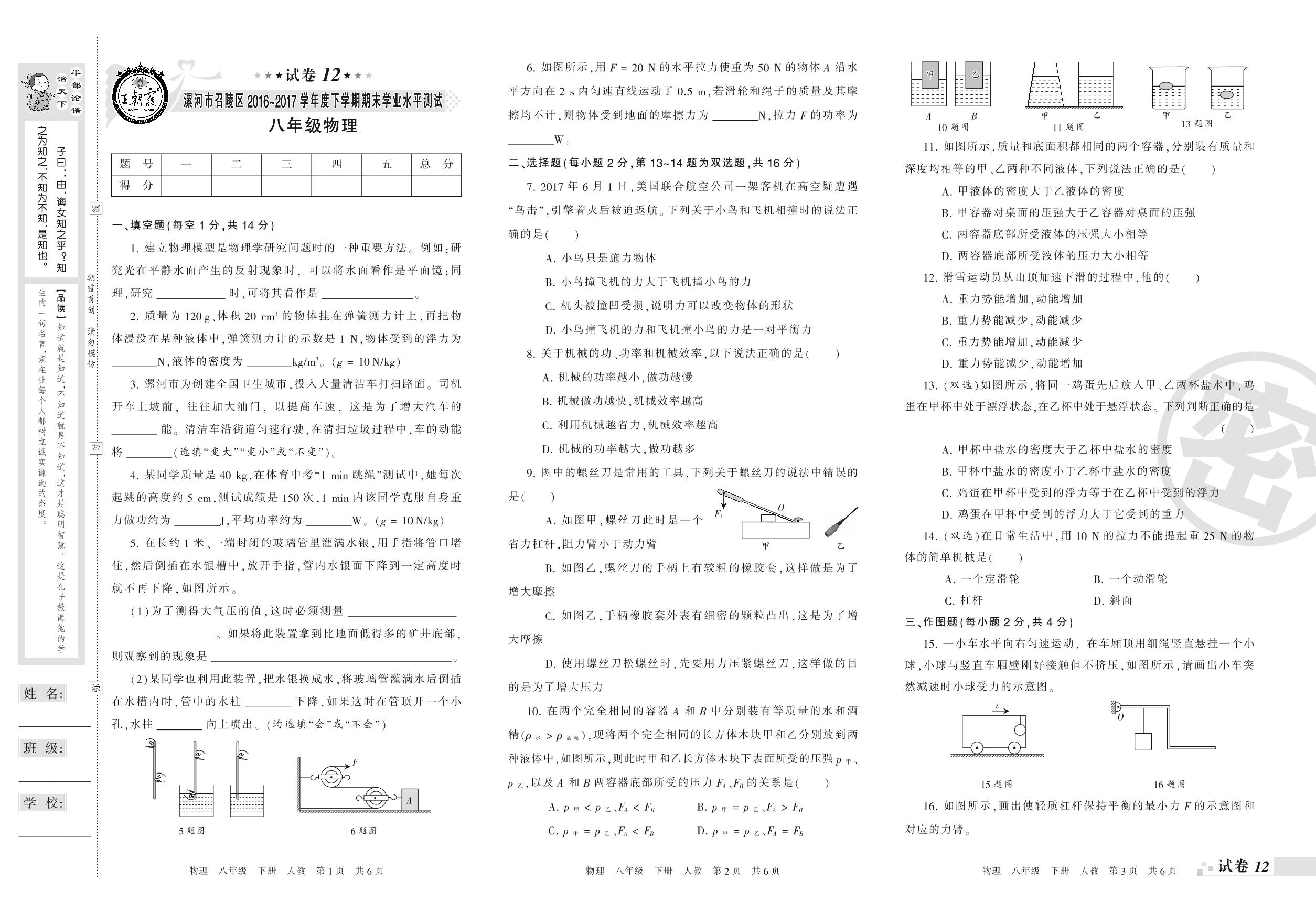 2016-2017学年第二学期漯河市召陵区八年级物理试卷(人教版)【12】