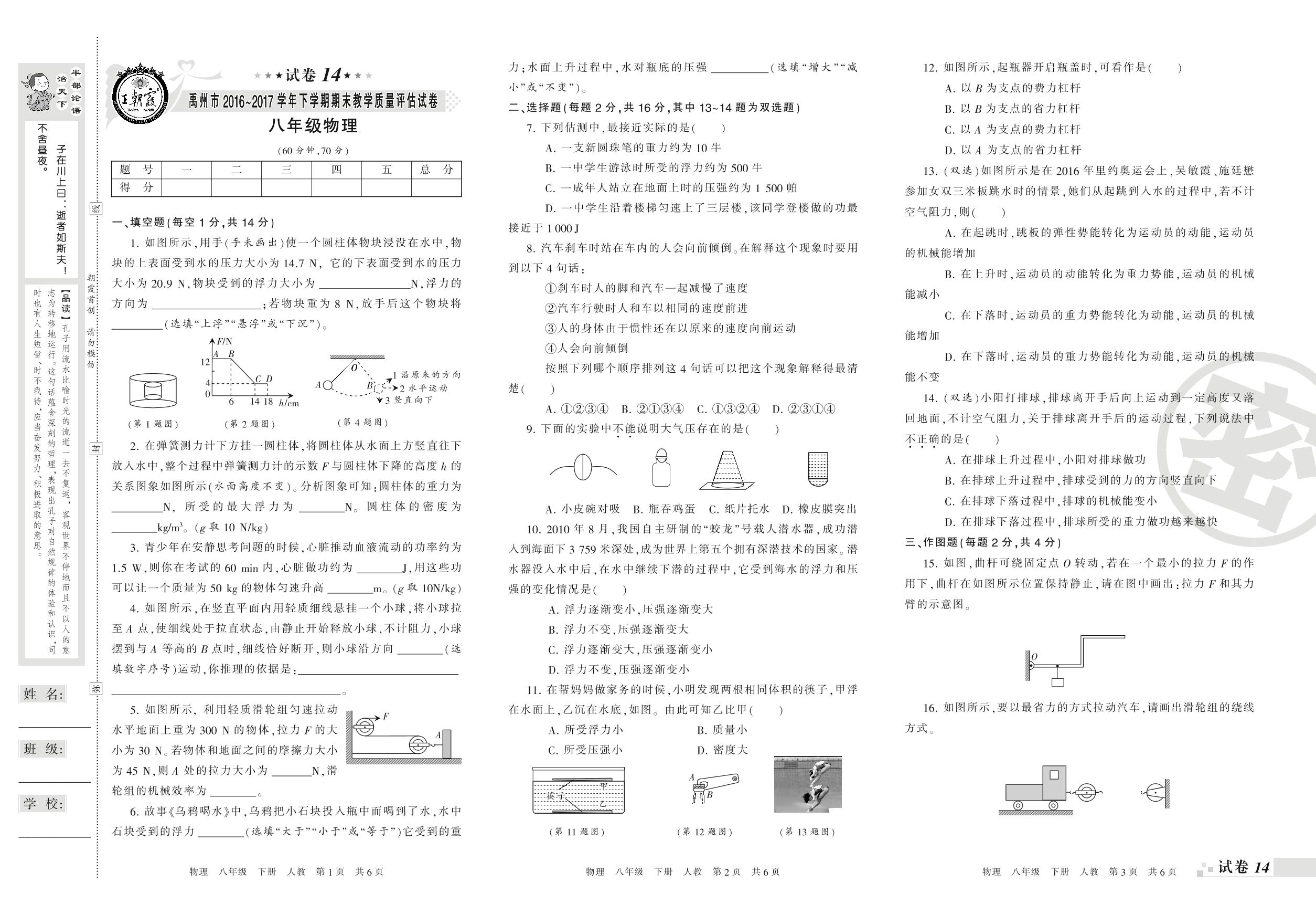 2016-2017学年第二学期禹州市八年级物理试卷(人教版)【14】