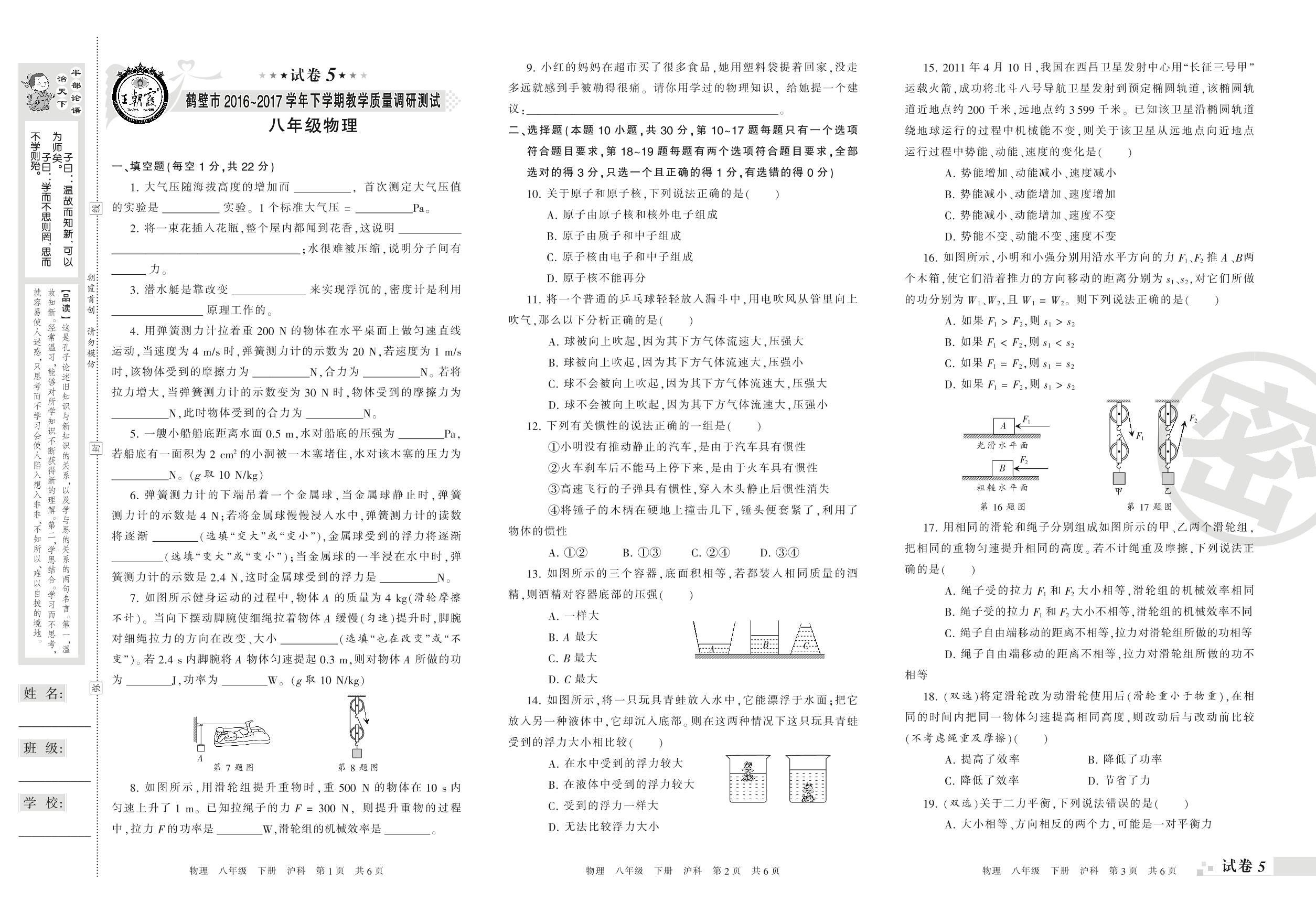 2016-2017学年第二学期鹤壁市八年级物理试卷(沪科版)【5】