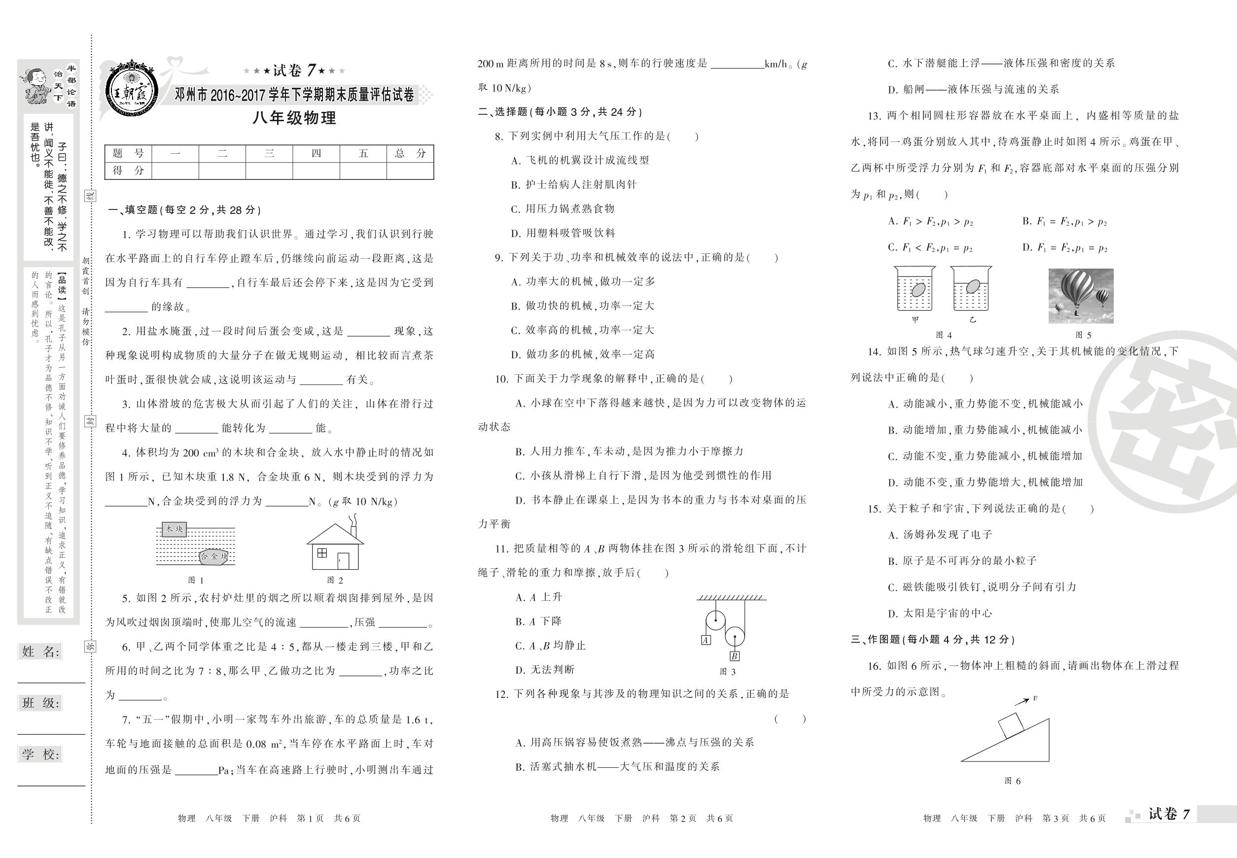 2016-2017学年第二学期邓州市八年级物理试卷(沪科版)_R220122144522166【7】