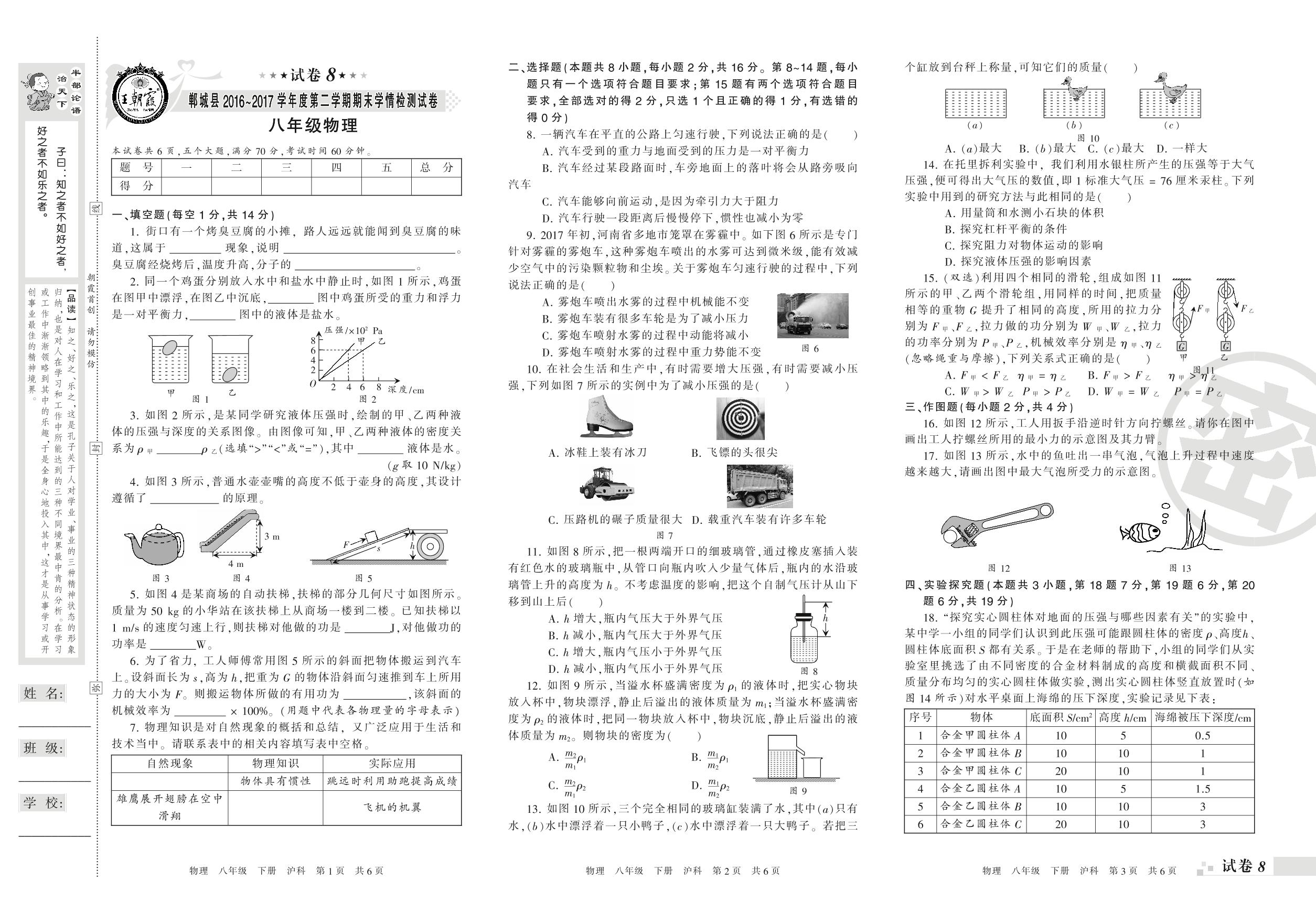 2016-2017学年第二学期周口市郸城县八年级物理试卷(沪科版)【8】