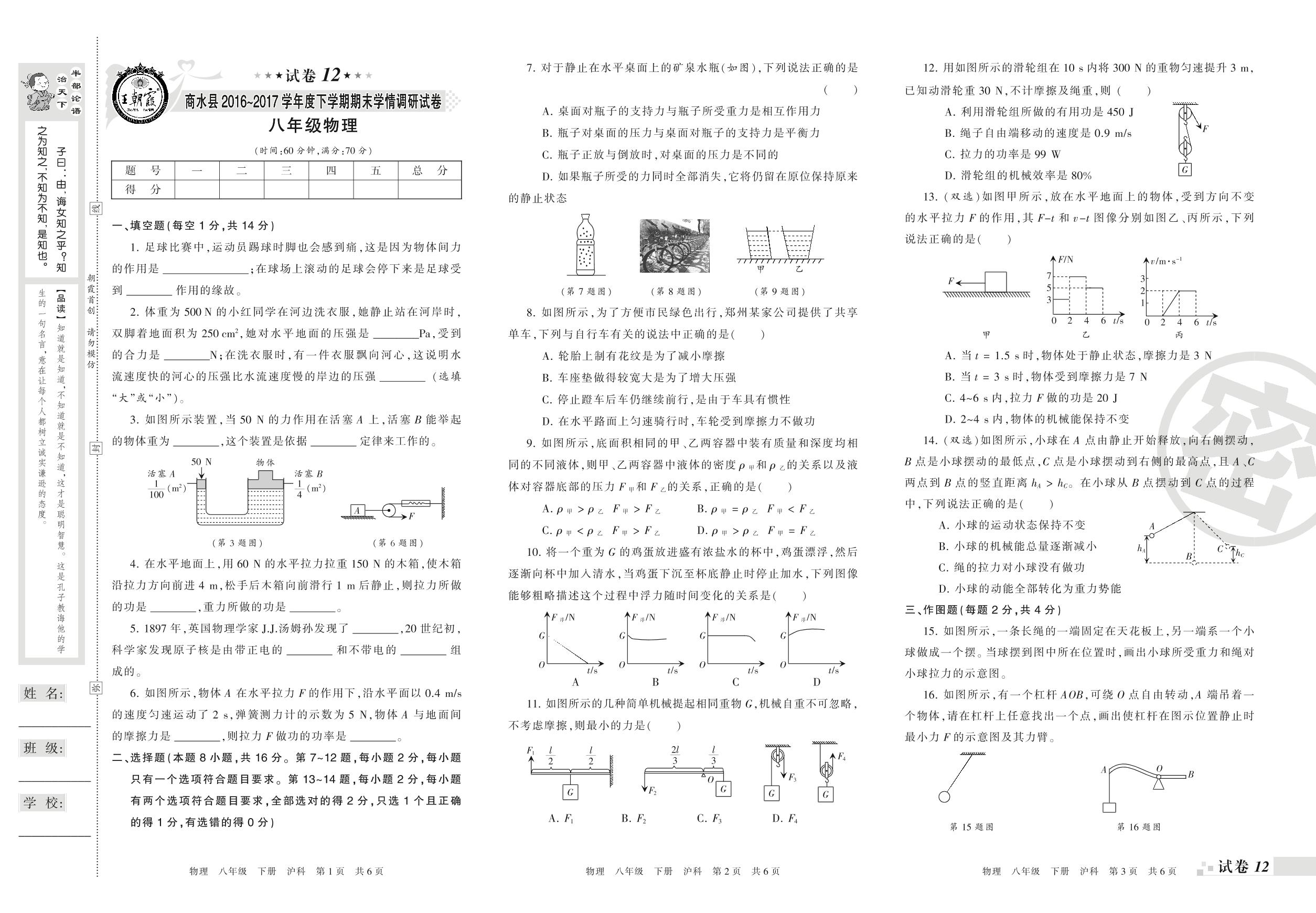 2016-2017学年第二学期周口市商水县八年级物理试卷(沪科版)【12】