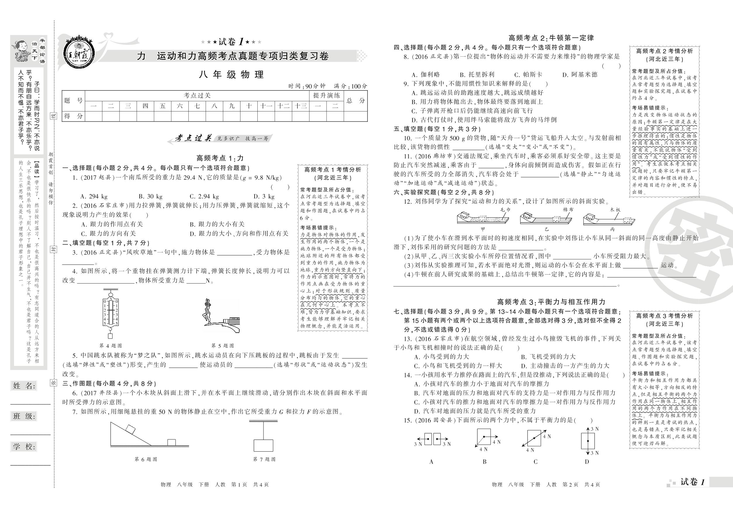 王朝霞期末专项卷——力 运动和力高频考点真题专项归类复习卷八年级下册物理(人教版)_R210810195653【1】
