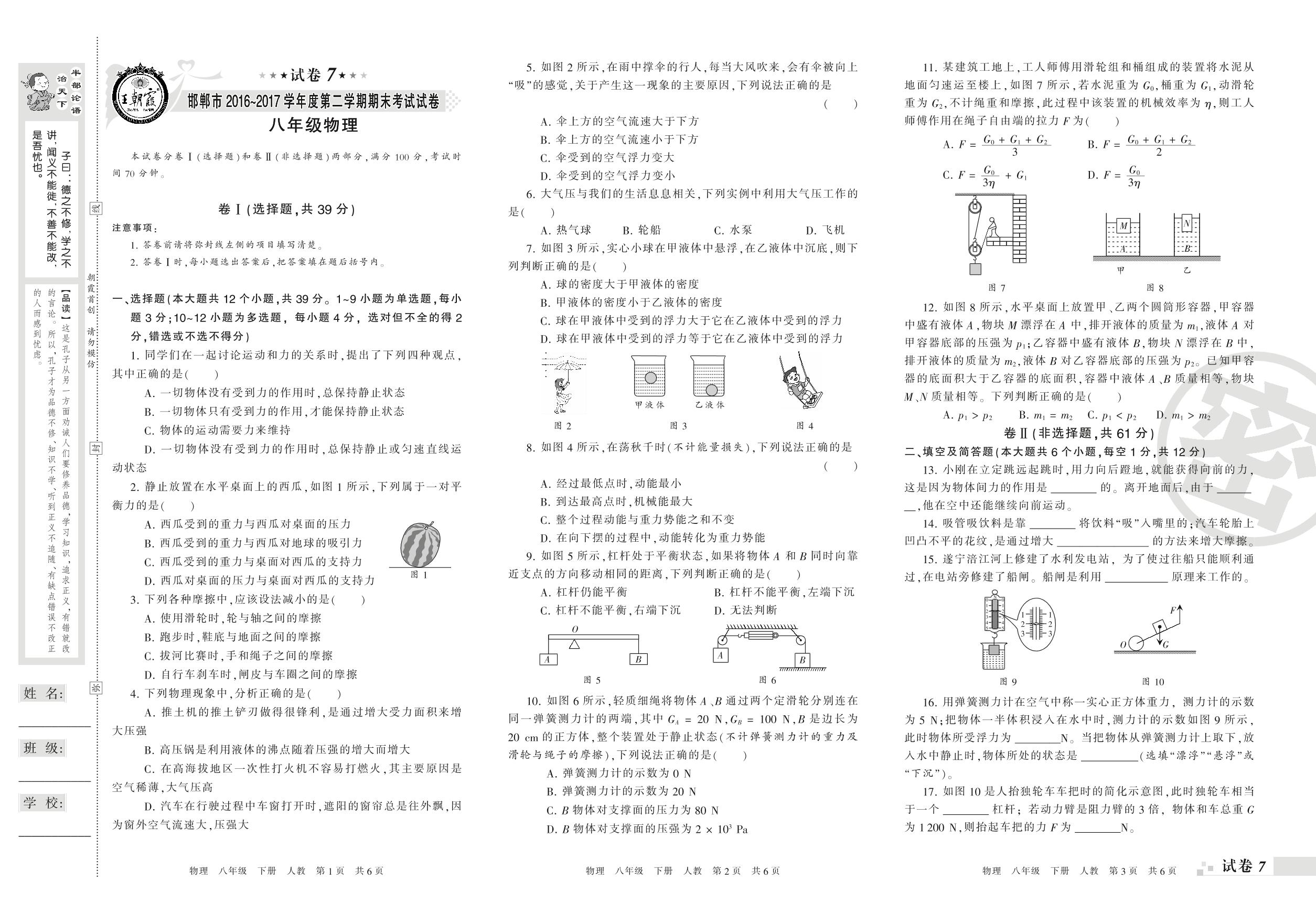 八年级物理人教版下册期末卷