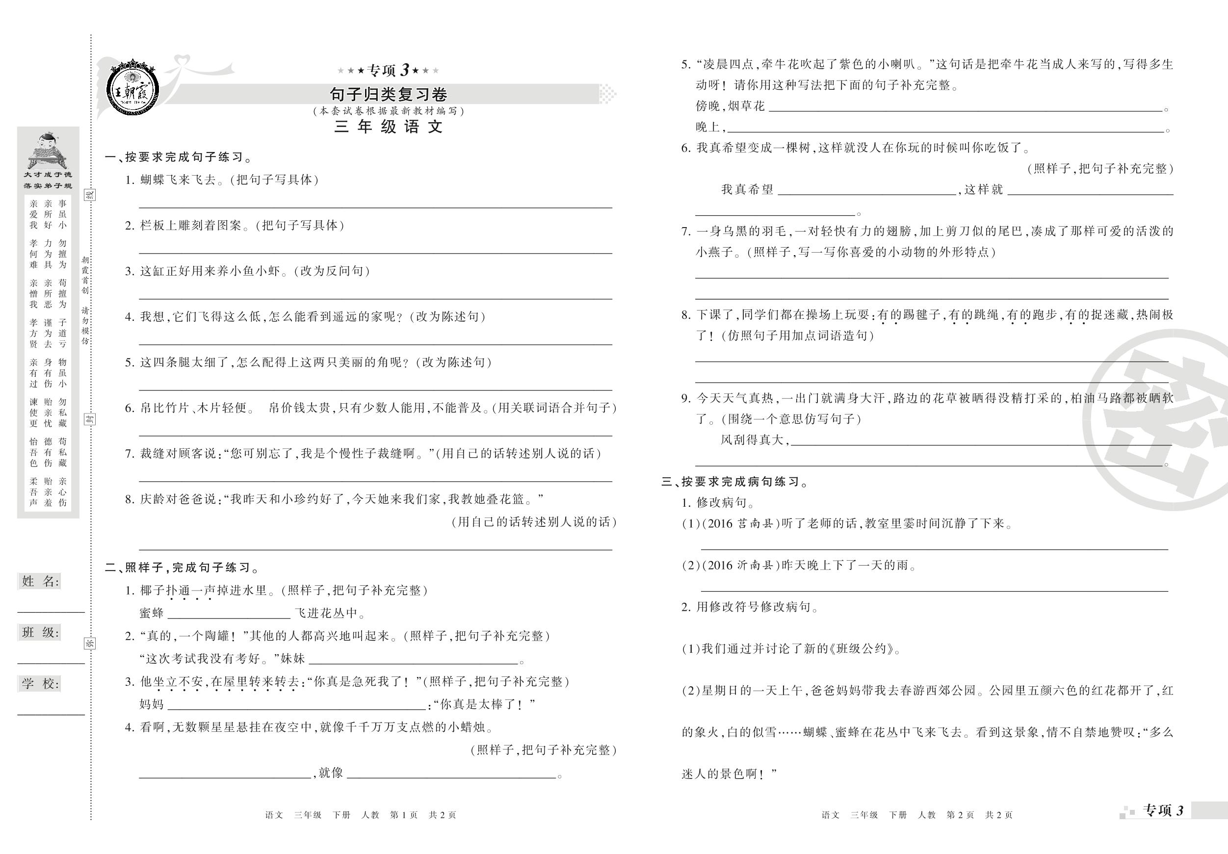 王朝霞期末专项卷句子、课文内容归类复习三年级下册语文(人教版)_R21080194328【0】