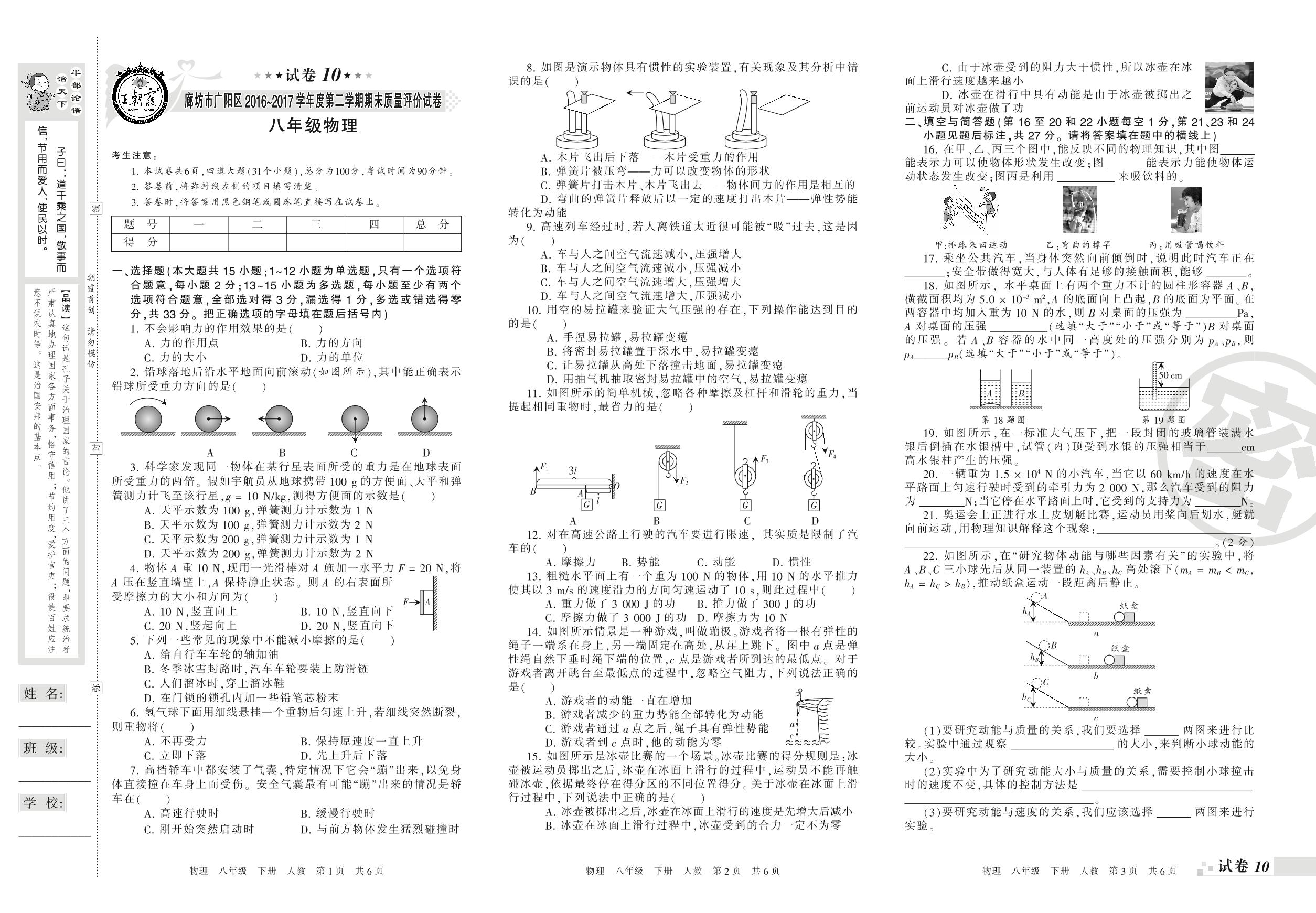 2016-2017学年第二学期廊坊市广阳区八年级物理试卷(人教版)【10】