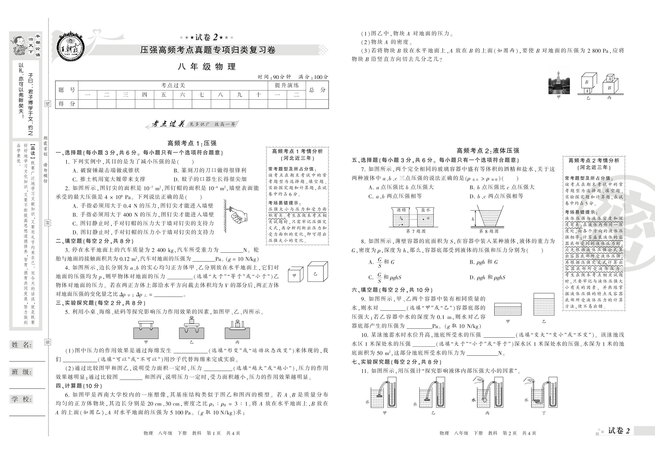 王朝霞期末专项卷——压强高频考点真题专项归类复习卷八年级下册物理(教科版)【2】
