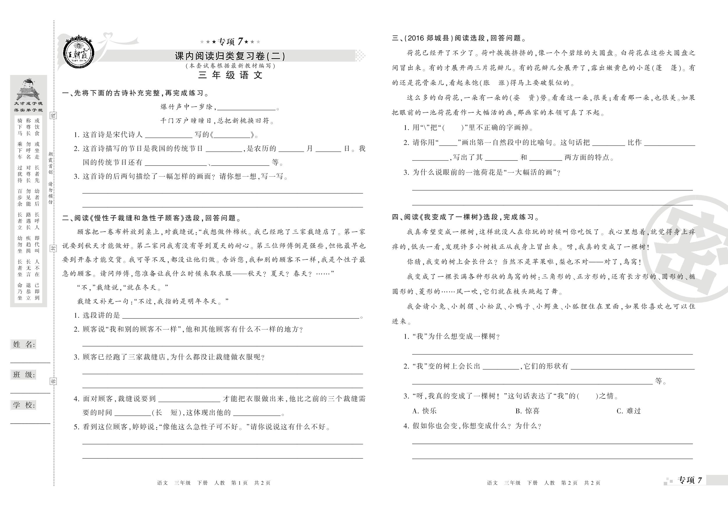 王朝霞期末专项卷——课内阅读、课外阅读与写作归类复习三年级下册语文(人教版)_R21080194340【0】