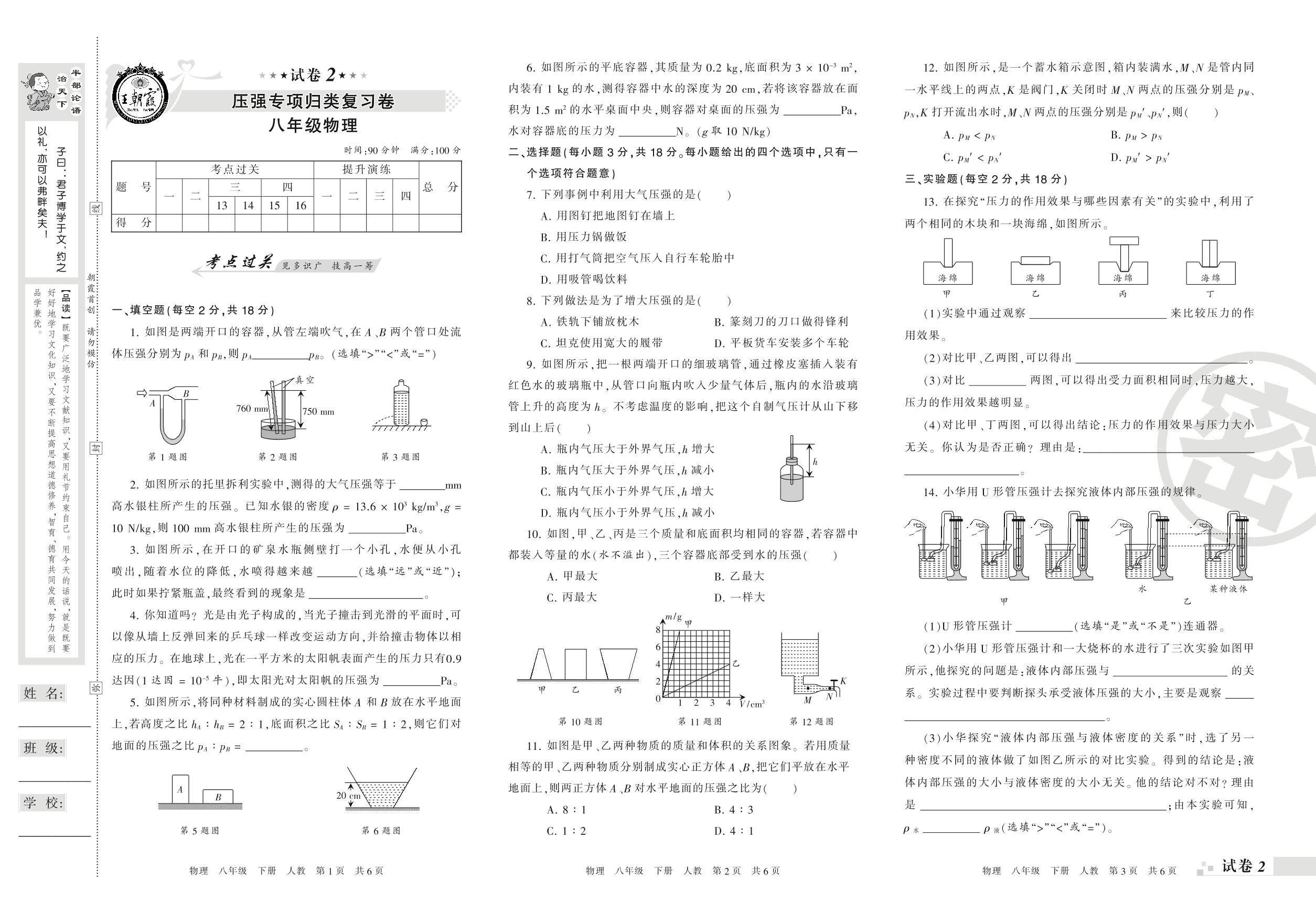 王朝霞期末专项卷——压强专项归类复习卷八年级下册物理(人教版)【2】