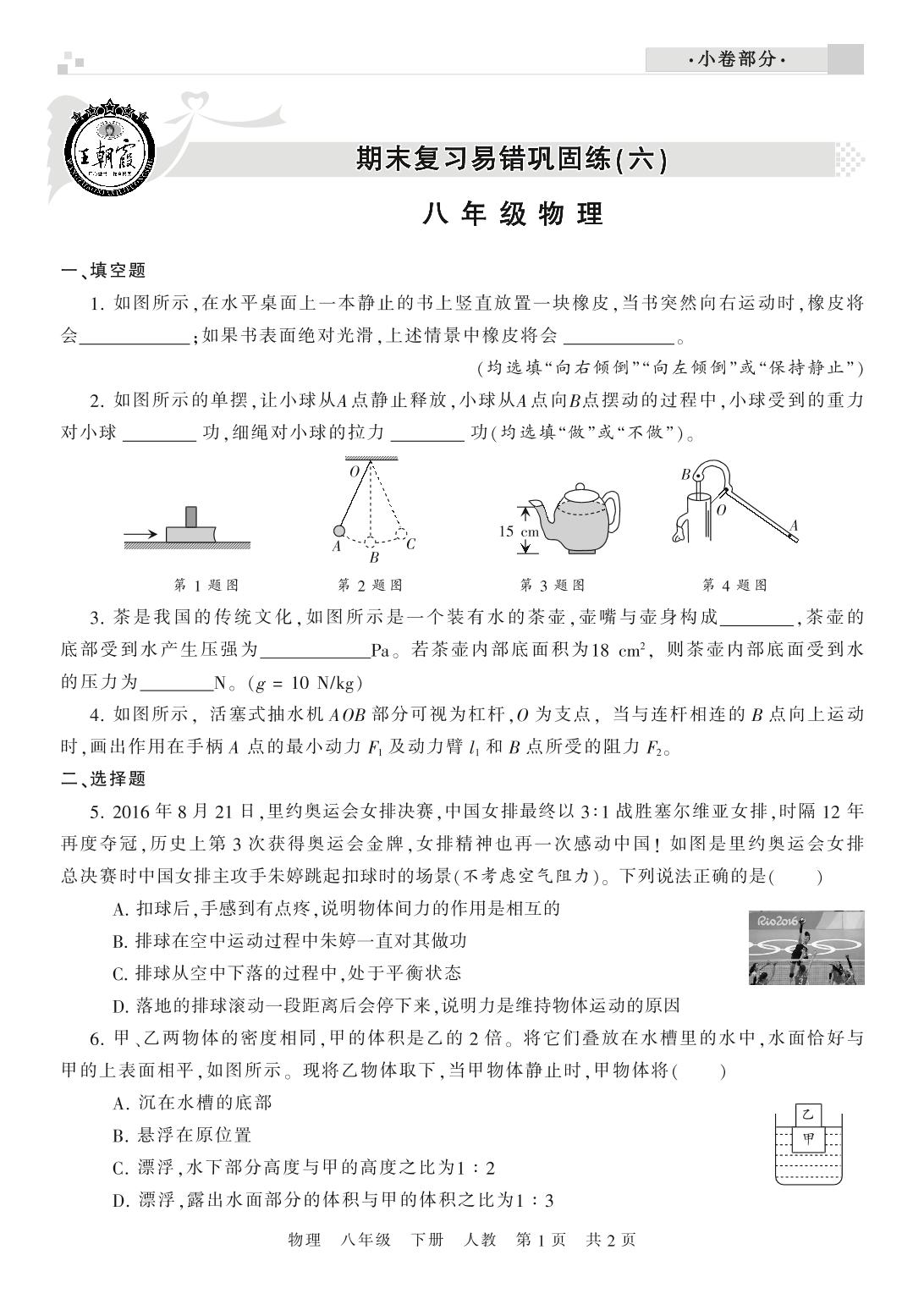 王朝霞期末小卷——期末复习易错巩固练(六)八年级下册物理(人教版)【0】
