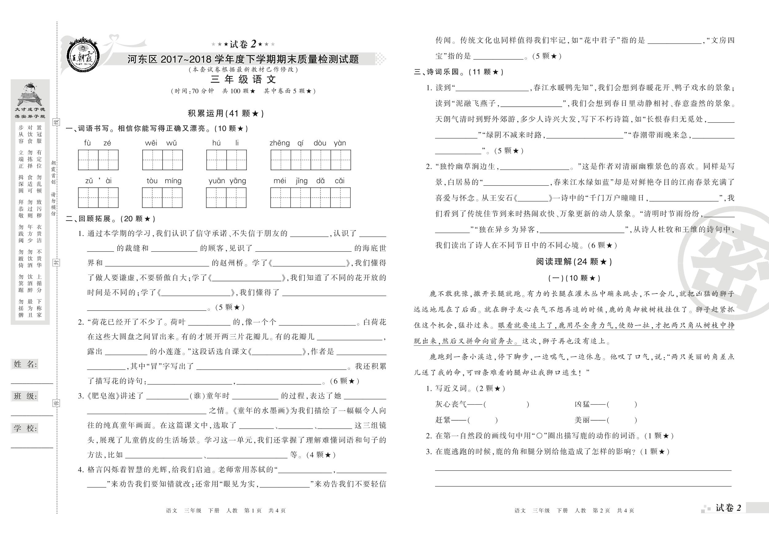 2017-2018学年第二学期临沂市河东区三年级语文试卷(人教版)【2】