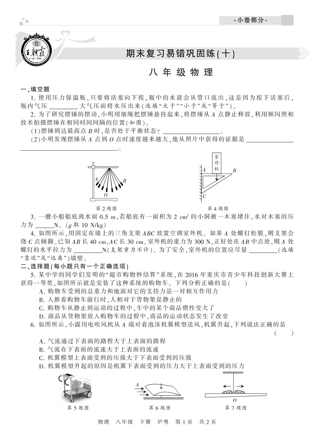王朝霞期末小卷——期末复习易错巩固练(十)八年级下册物理(沪粤版)【0】