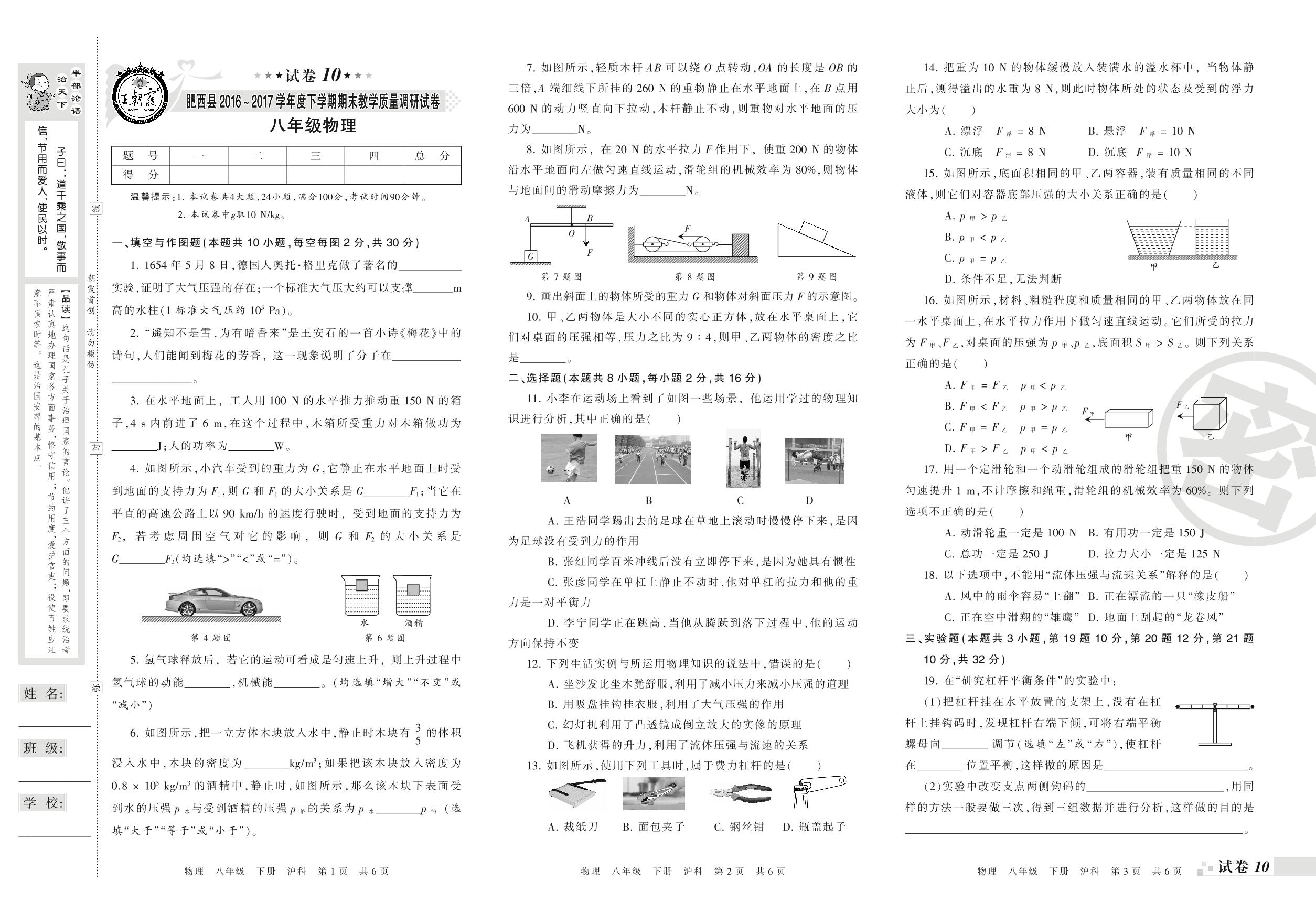 2016-2017学年第二学期肥西县八年级物理试卷(沪科版)【10】
