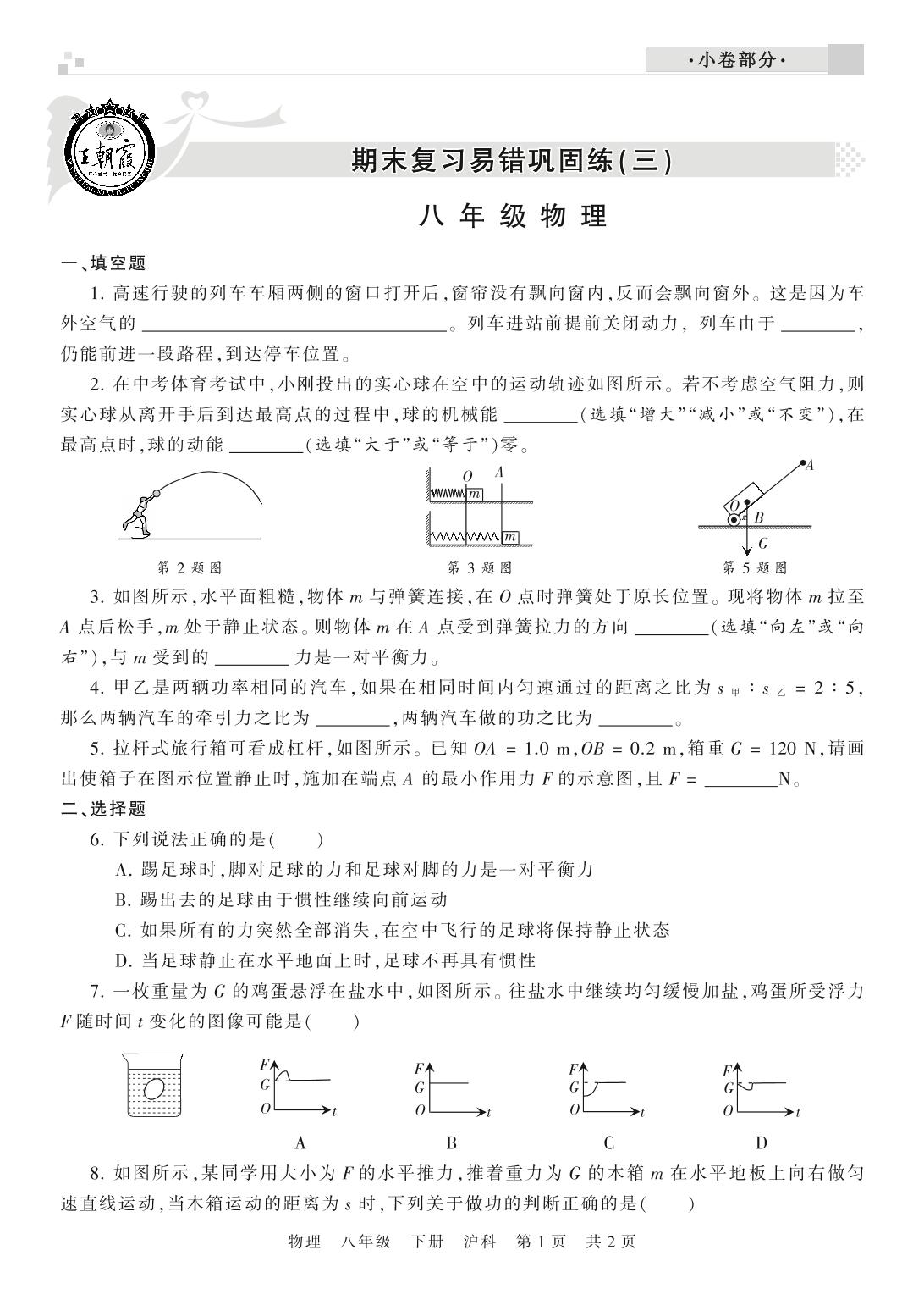 王朝霞期末小卷——期末复习易错巩固练(三)八年级下册物理(沪科版)【0】