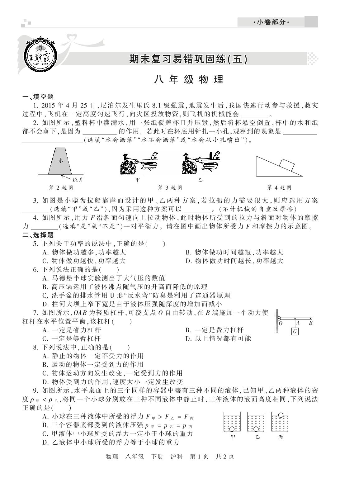 王朝霞期末小卷——期末复习易错巩固练(五)八年级下册物理(沪科版)【0】