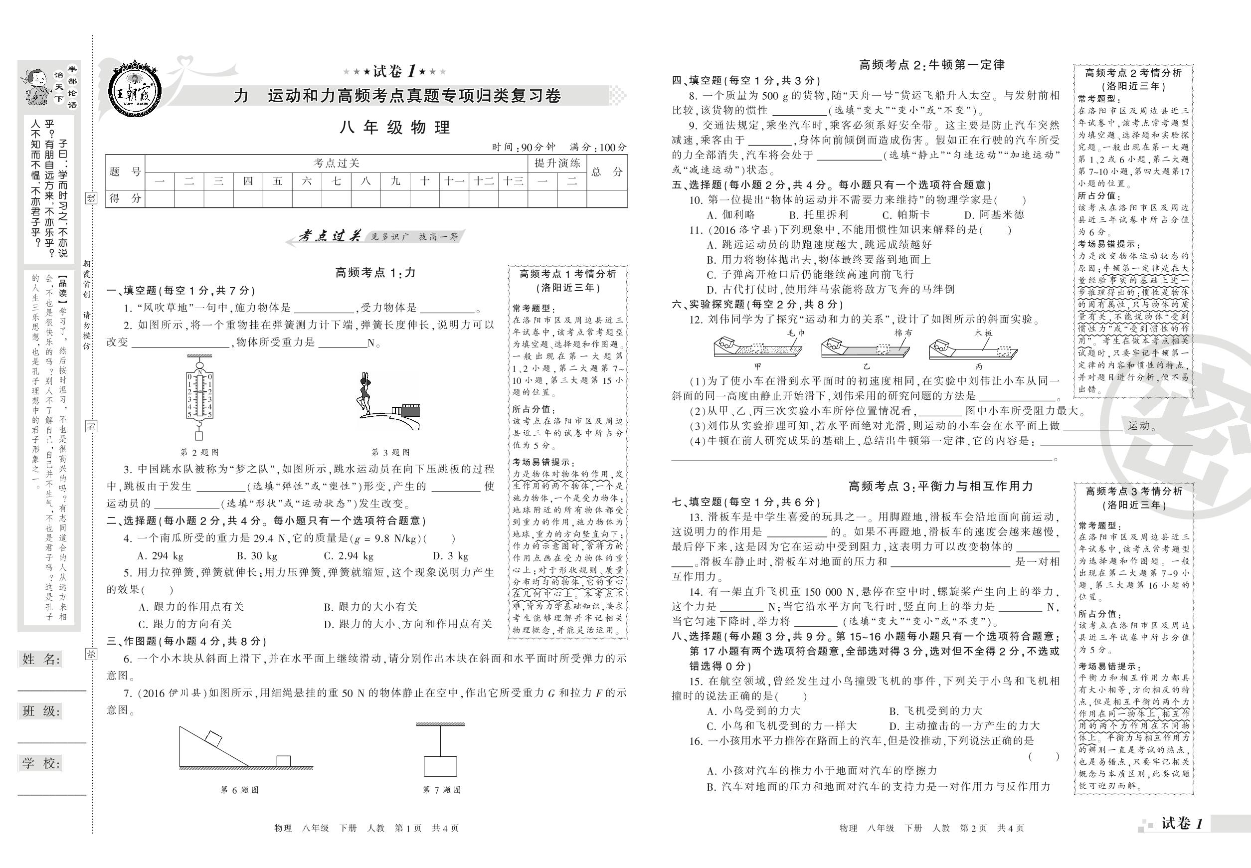 王朝霞期末专项卷——力 运动和力高频考点真题专项归类复习卷八年级下册物理(人教版)_R220122153805603【1】