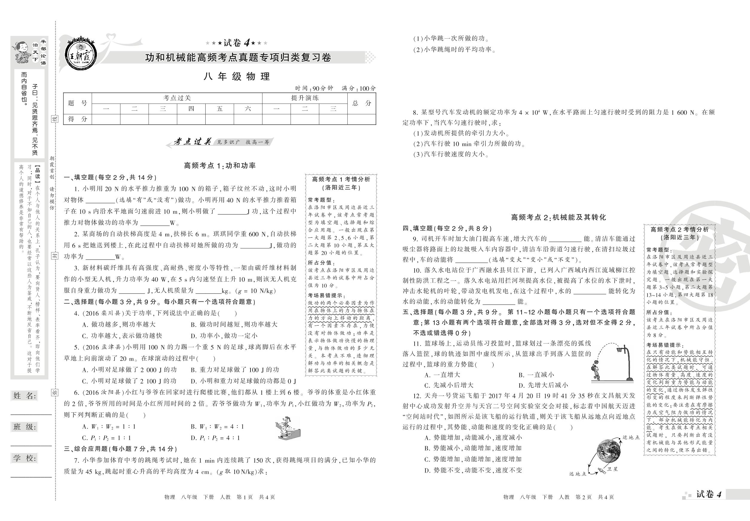 王朝霞期末专项卷——功和机械能高频考点真题专项归类复习卷八年级下册物理(人教版)_R220122153805013【4】