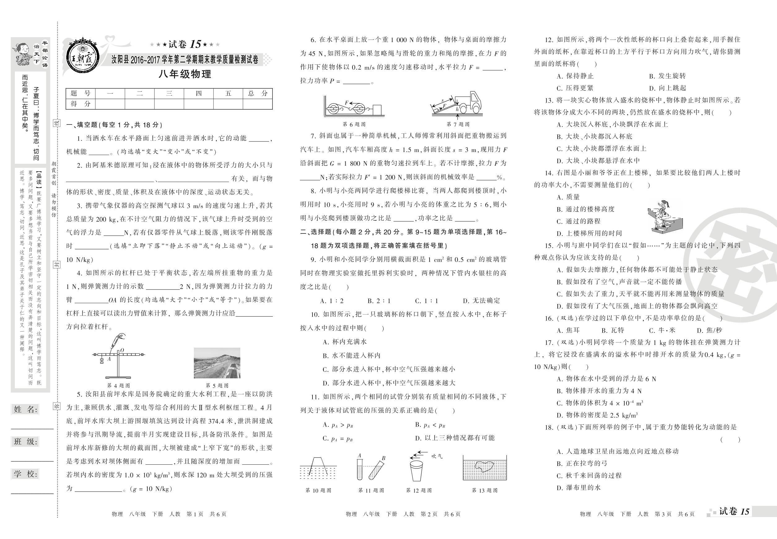 2016-2017学年第二学期洛阳市汝阳县八年级物理试卷(人教版)【15】