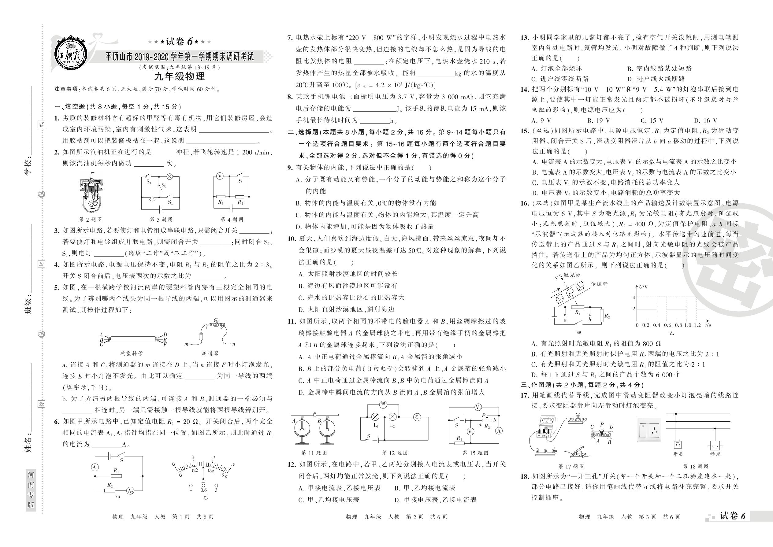 2019-2020学年第一学期平顶山市九年级物理试卷(人教版)【6】