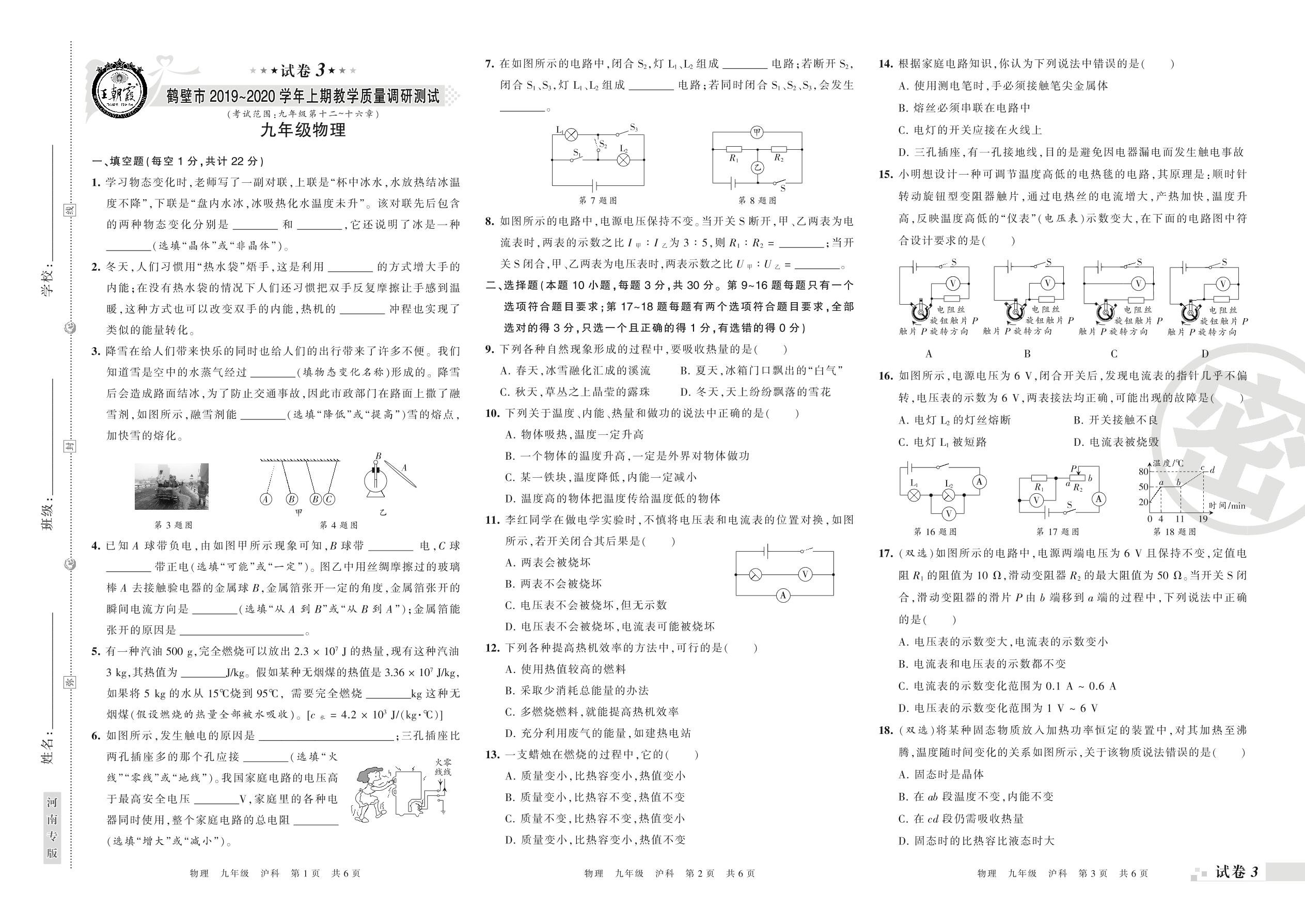 2019-2020学年第一学期鹤壁市九年级物理试卷(沪科版)【3】
