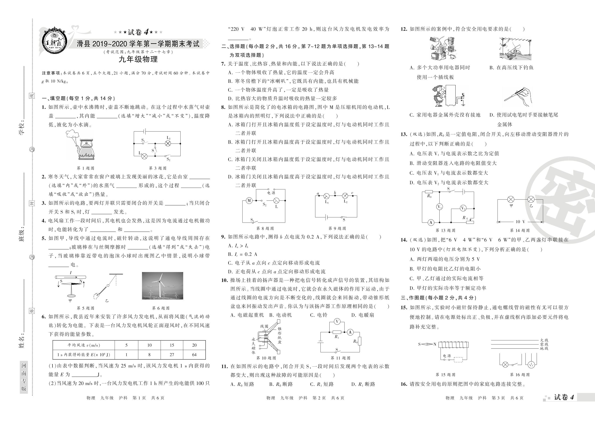 2019-2020学年第一学期安阳市滑县九年级物理试卷(沪科版)【4】