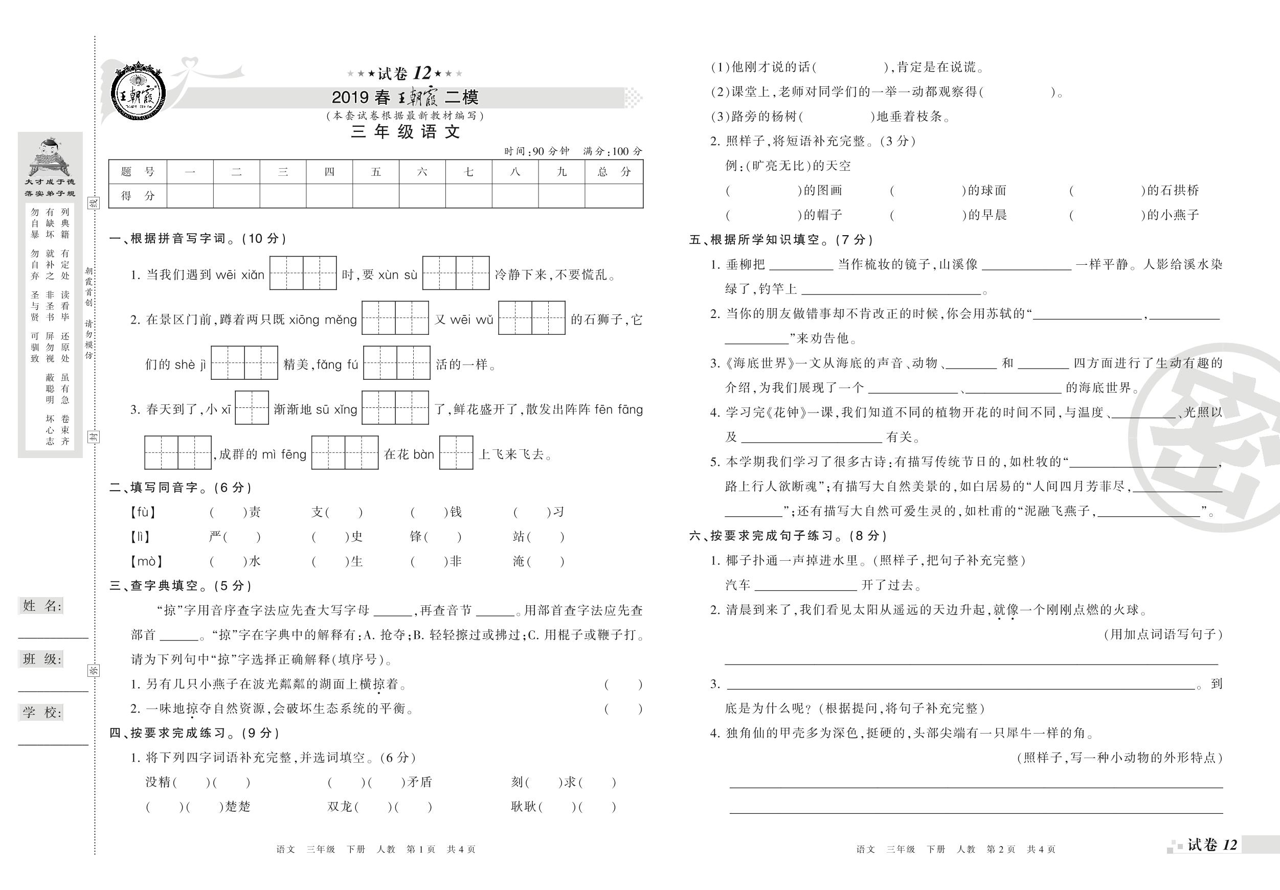 王朝霞期末模拟卷三年级下册语文(人教版)【12】