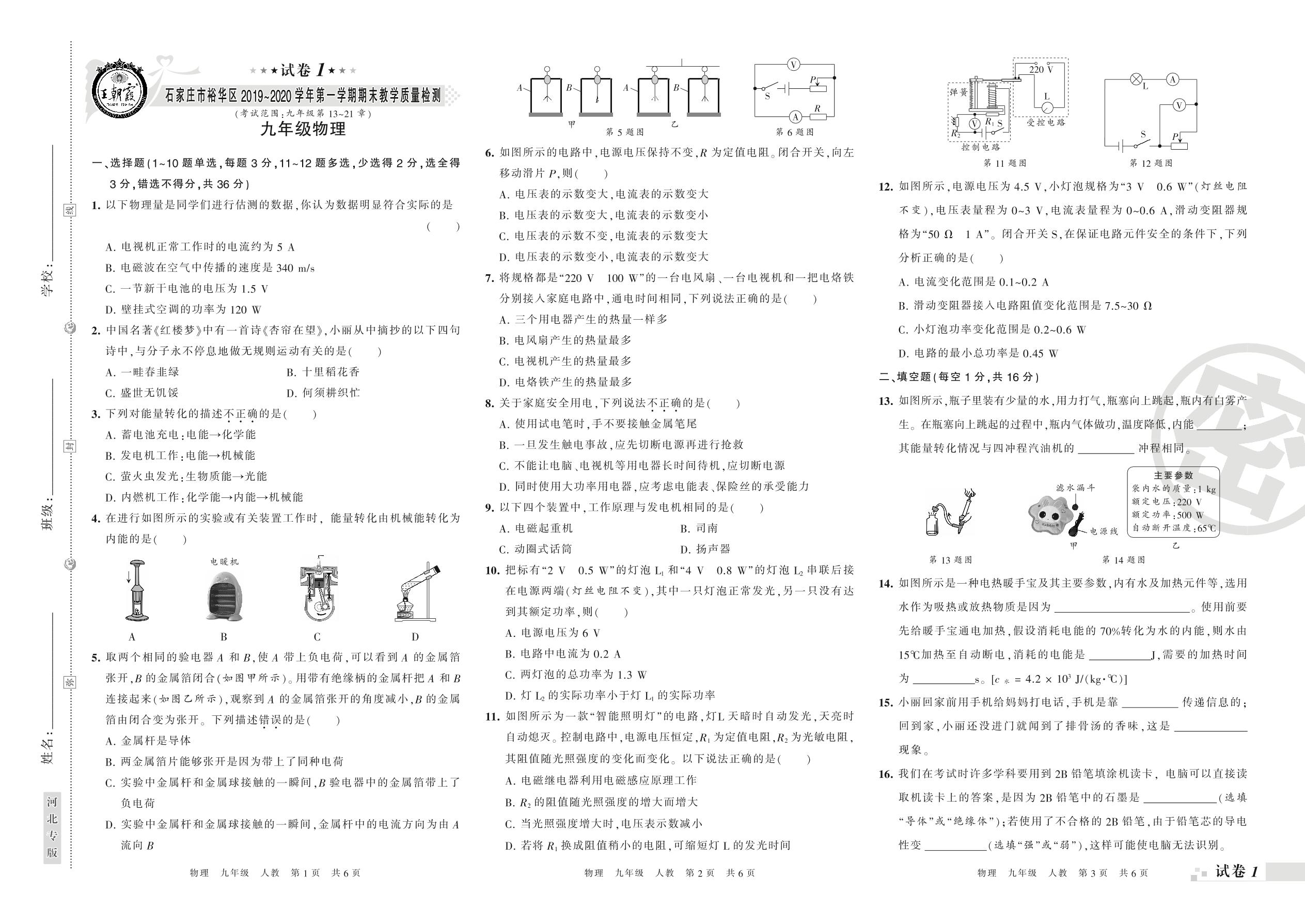 2019-2020学年第一学期石家庄市裕华区九年级物理试卷(人教版)【1】