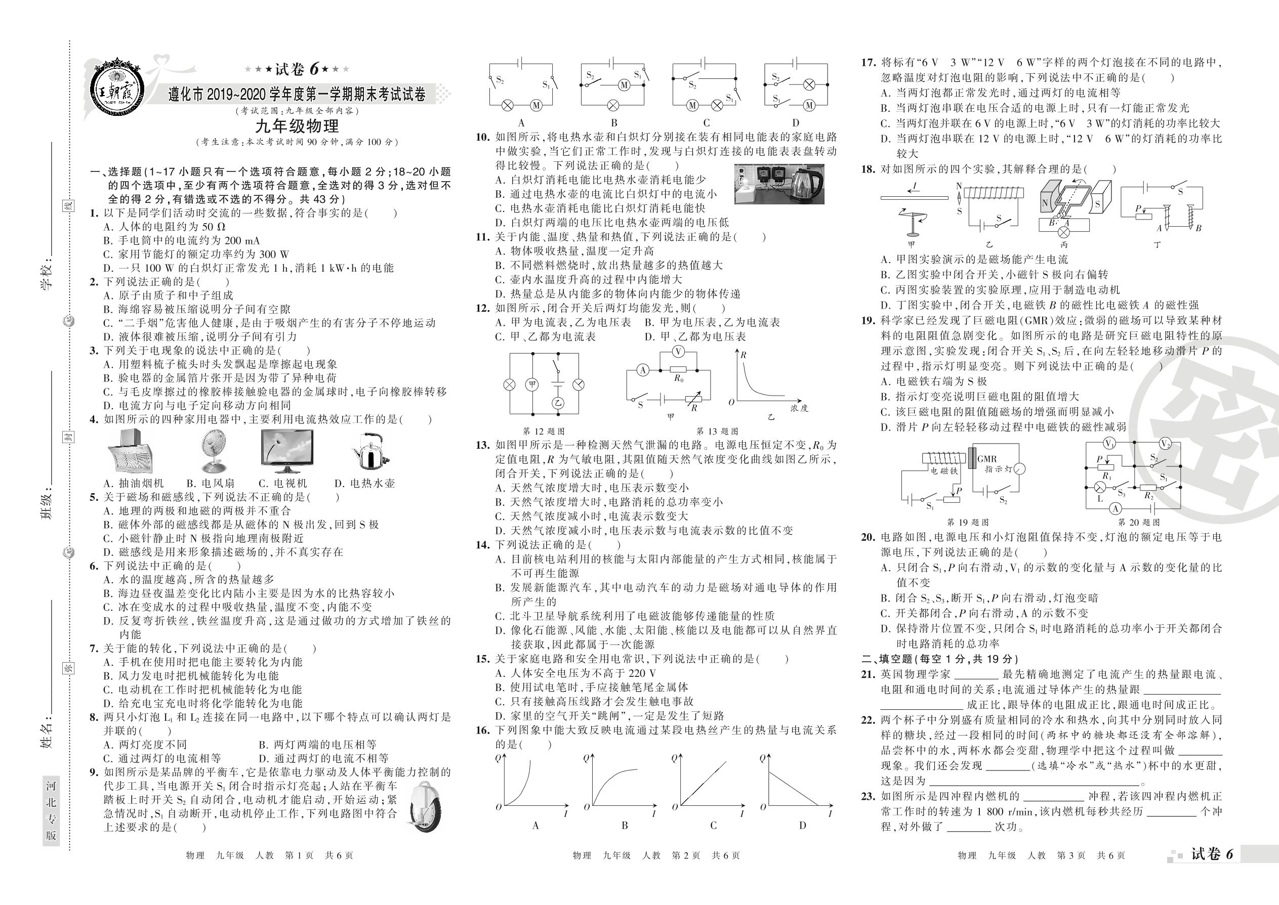 2019-2020学年第一学期遵化市九年级物理试卷(人教版)【6】