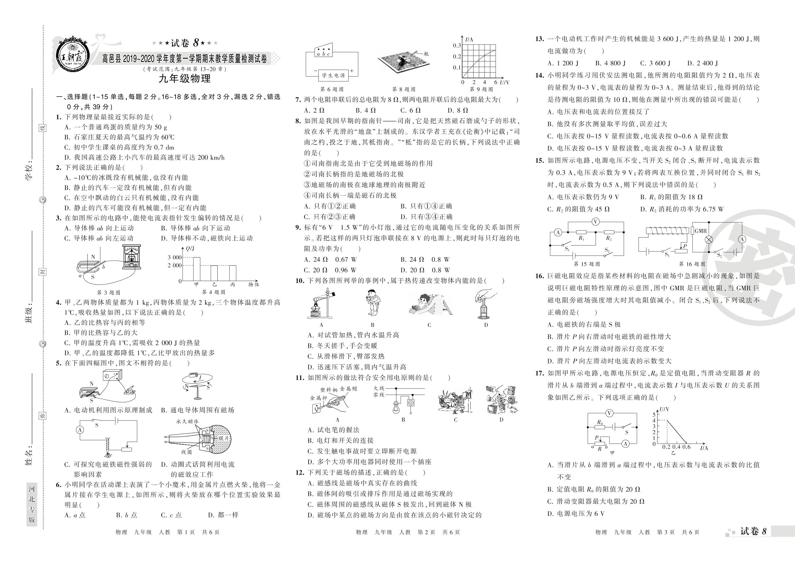 2019-2020学年第一学期石家庄市高邑县九年级物理试卷(人教版)【8】