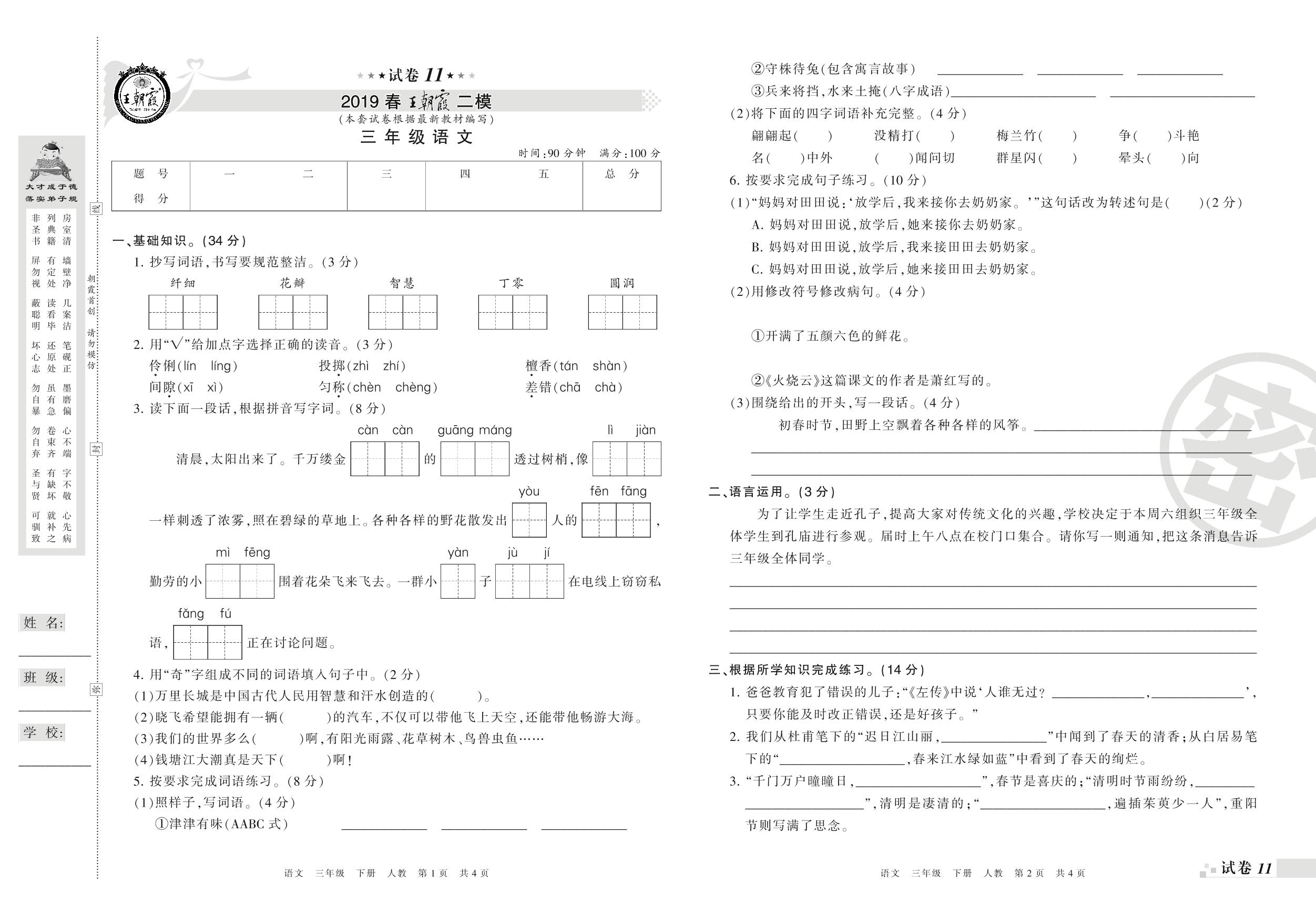 王朝霞期末模拟卷三年级下册语文(人教版)_R21080194517【11】